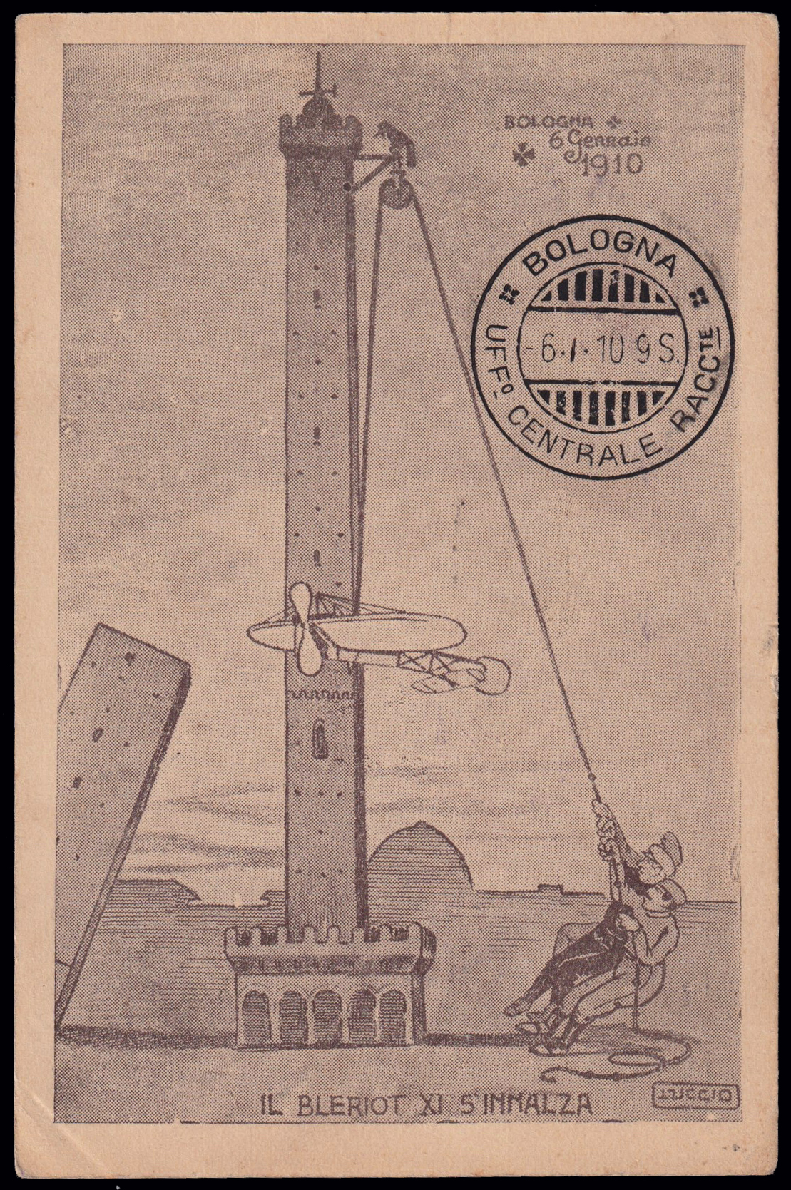 1910 BOLOGNA / PRIMO SPETTACOLO DI AVIAZIONE. Cartolina satirica "Il Bleriot XI s'innalza" firmata Luccio. Riprodotta a pagina 43 del libro "Aerofilia Italiana - edizione 2007" di F. Longhi. Longhi 213. Rara. (Image) (ImageA)