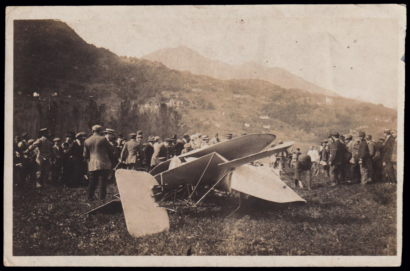1910 BRIGA - DOMODOSSOLA PRIMA TRAVERSATA DELLE ALPI. Fotografia originale d'epoca che ritrae il velivolo Bleriot distrutto del peruviano Chavez