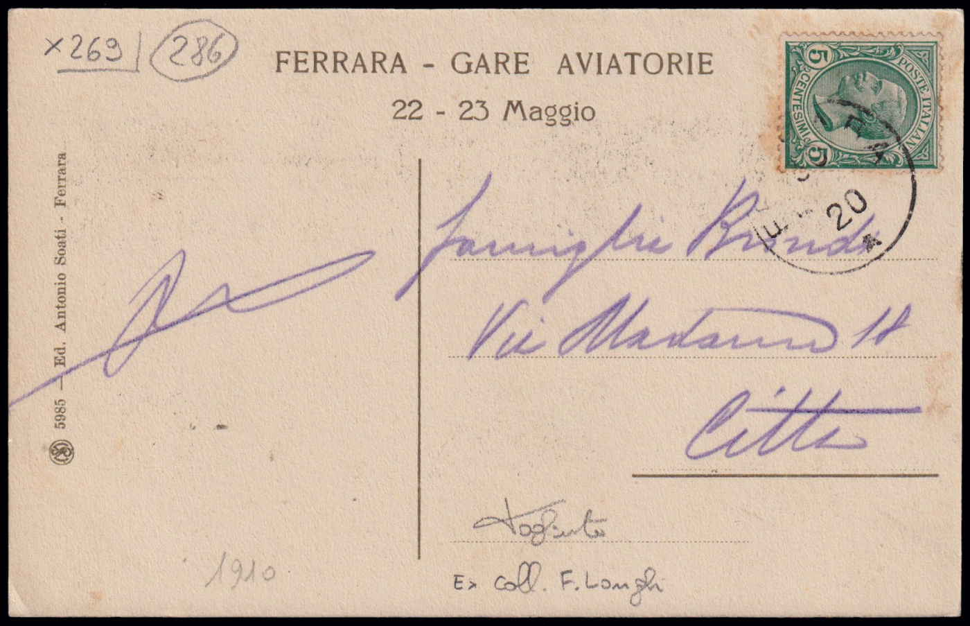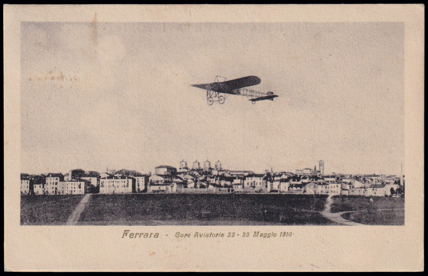 1910 FERRARA / GARE AVIATORIE. Cartolina ufficiale a stampa 5985 - Ed. Antonio Soatti, Ferrara, viaggiata. Riprodotta a pagina 47 del libro "Aerofilia Italiana - edizione 2007" di F. Longhi. Longhi 277. Rarità. (Image) (ImageA)