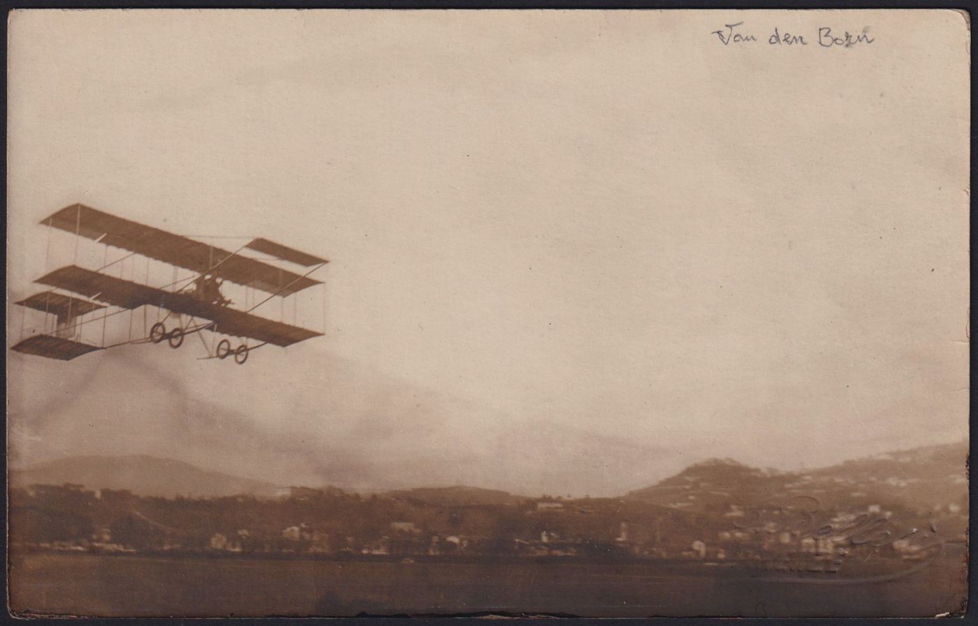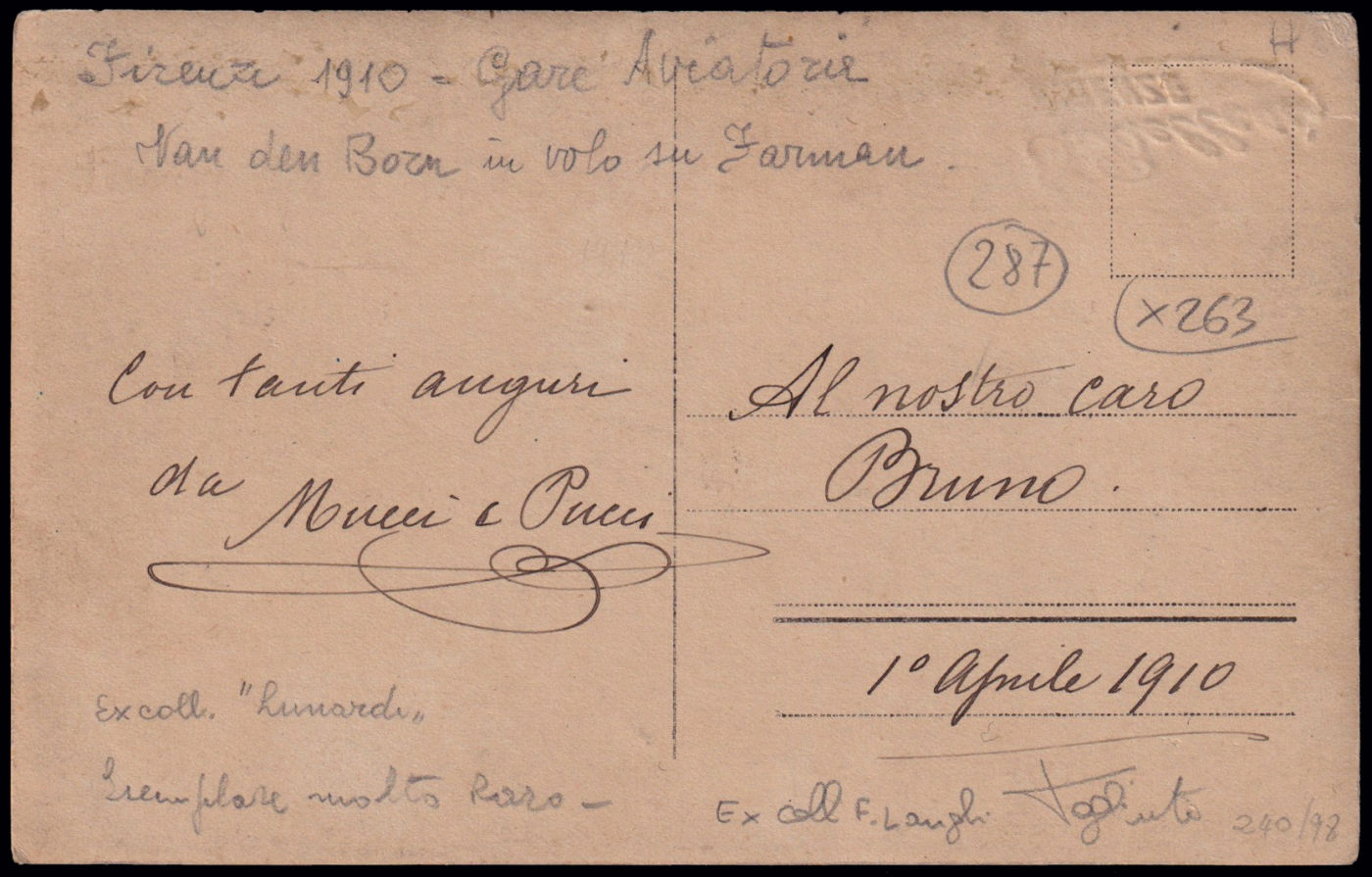 1910 FIRENZE SPETTACOLI DI AVIAZIONE. Cartolina fotografica dell'aeroplano Farman pilotato dal belga Eugenio Van den Born. Longhi 234. Provenienza: ex coll. Lunardi. Molto rara. (Image) (ImageA)
