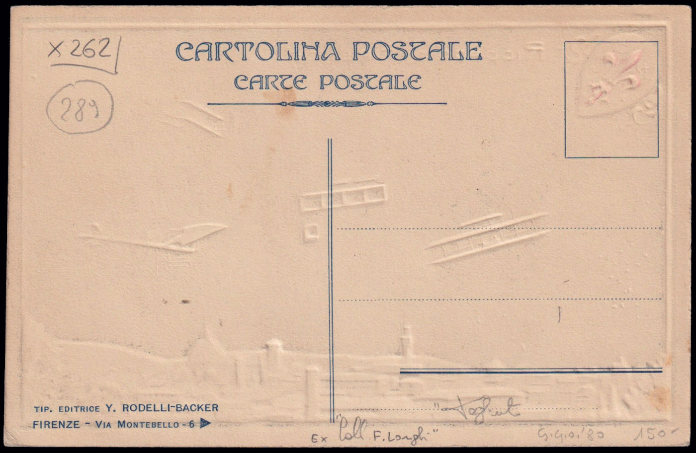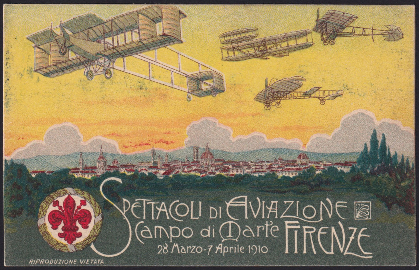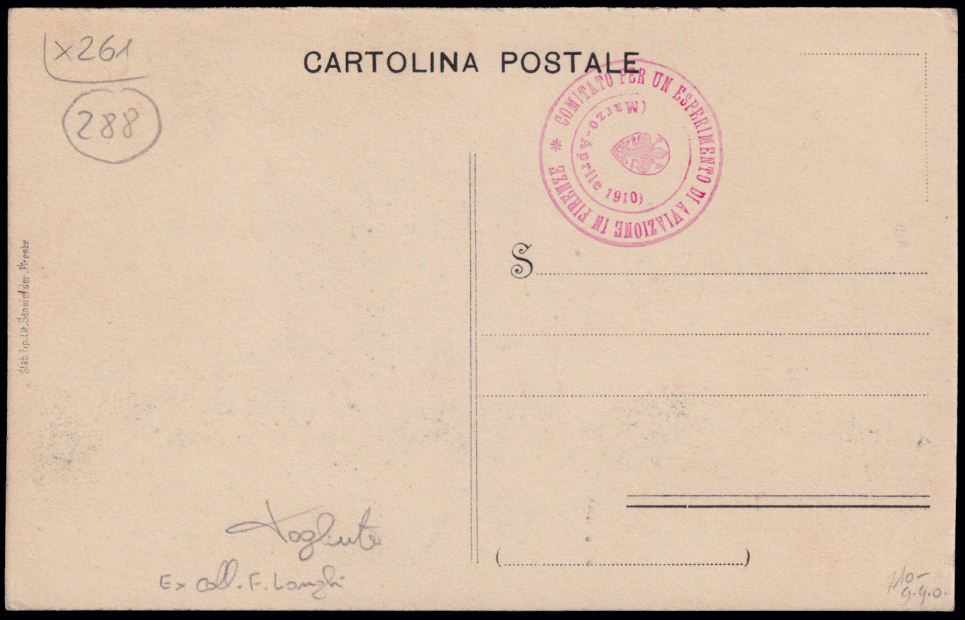1910 FIRENZE SPETTACOLI DI AVIAZIONE. Cartolina ufficiale policroma (Stab. Tip. Lit. Seneferder, Firenze). Al retro timbro rosso "Comitato....in Firenze", nuova. Longhi 233+232. Provenienza: G. G. Orlandini. (Image) (ImageA)