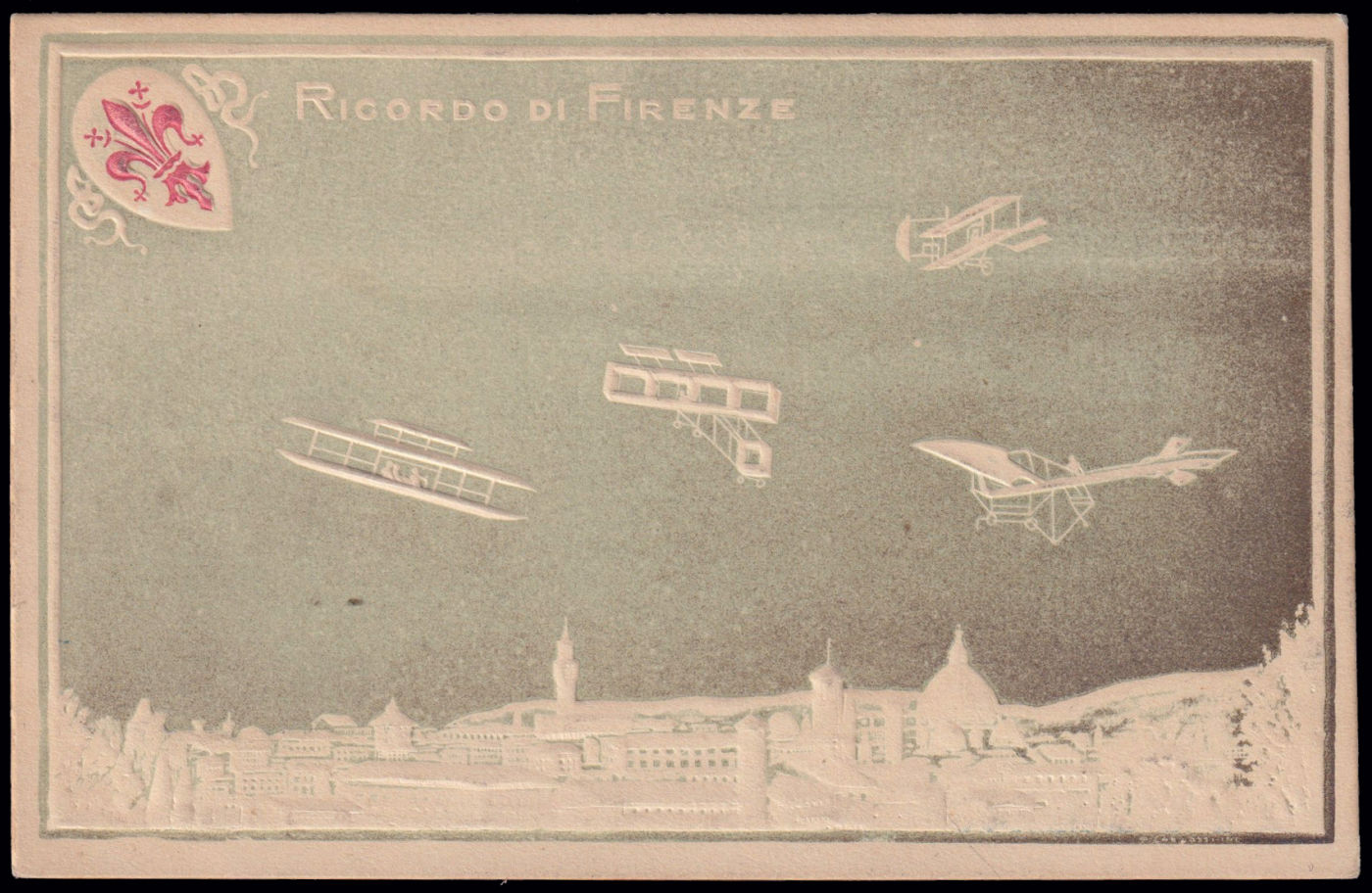 1910 FIRENZE SPETTACOLI DI AVIAZIONE. Cartolina a rilievo color verde, "Ricordo di Firenze" con aerei e stemma nell'angolo di sinistra, nuova. Longhi 234. Provenienza G.G. Orlandini. (Image) (ImageA)