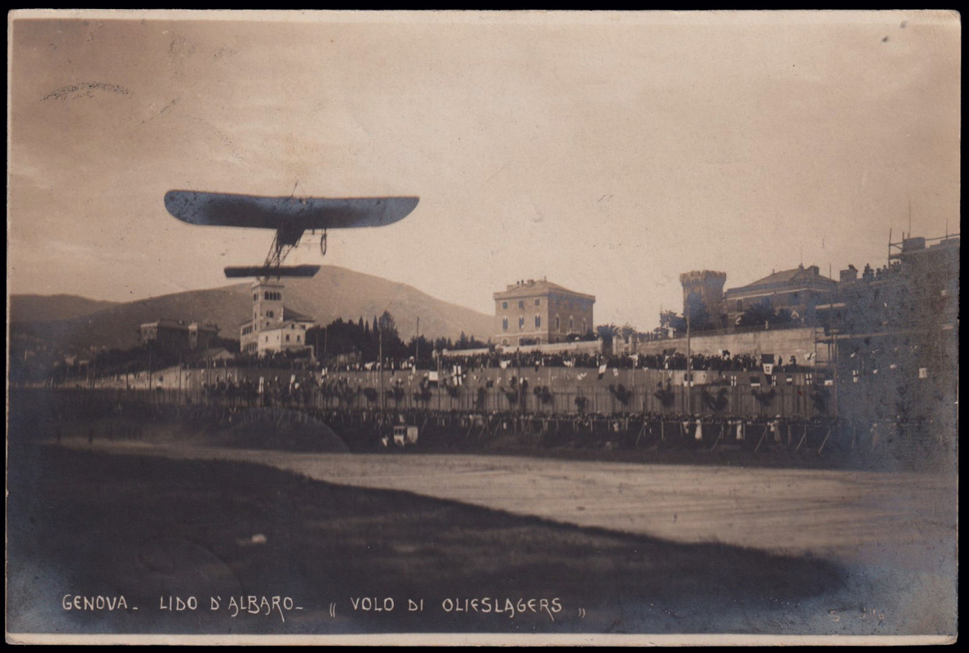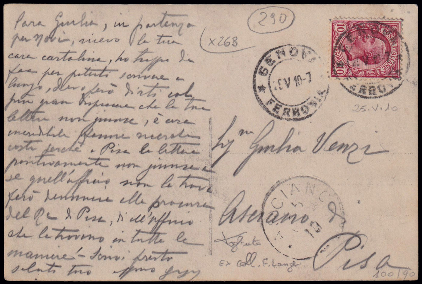 1910 GENOVA / PRIMO VOLO DI UN AEROPLANO SULLA CITTA'. Cartolina fotografica "Genova Lido d'Albaro", spedita da Genova per Pisa il 25/5/1910. Timbro di arrivo. Longhi 250. (Image) (ImageA)