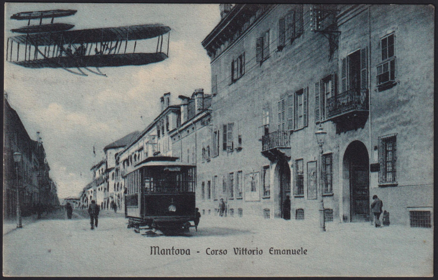 1910 MANTOVA / ESPERIMENTI D'AVIAZIONE. Cartolina con biplano e tram panoramica della città Ed. B. Panzani, viaggiata. Longhi 247.