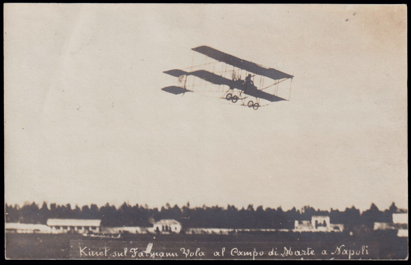 1910 NAPOLI / PROVE D'AVIAZIONE. Cartolina fotografica "Kinet vola al Campo di Marte a Napoli" ed. Tensi, non viaggiata. Riprodotta a pagina 77 del libro "Aerofilia Italiana - nuova edizione" di F. Longhi. Al retro