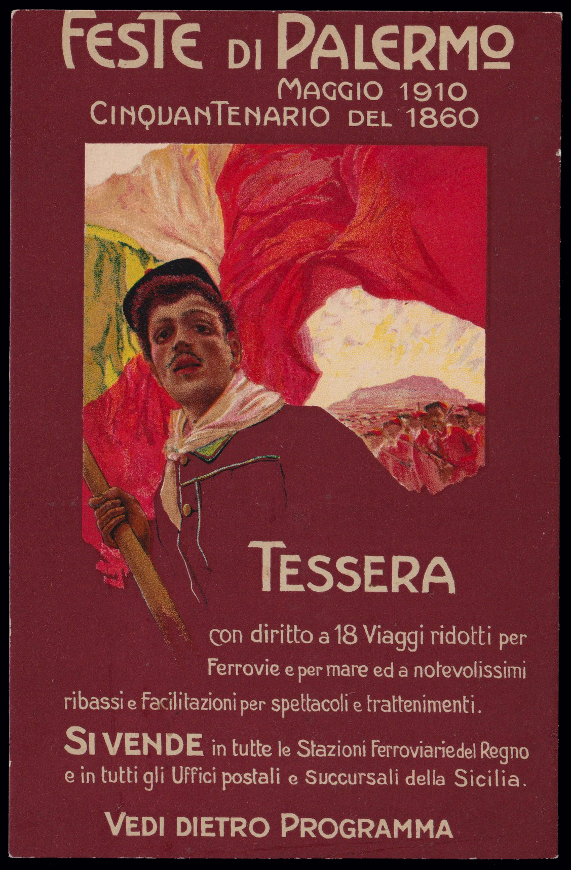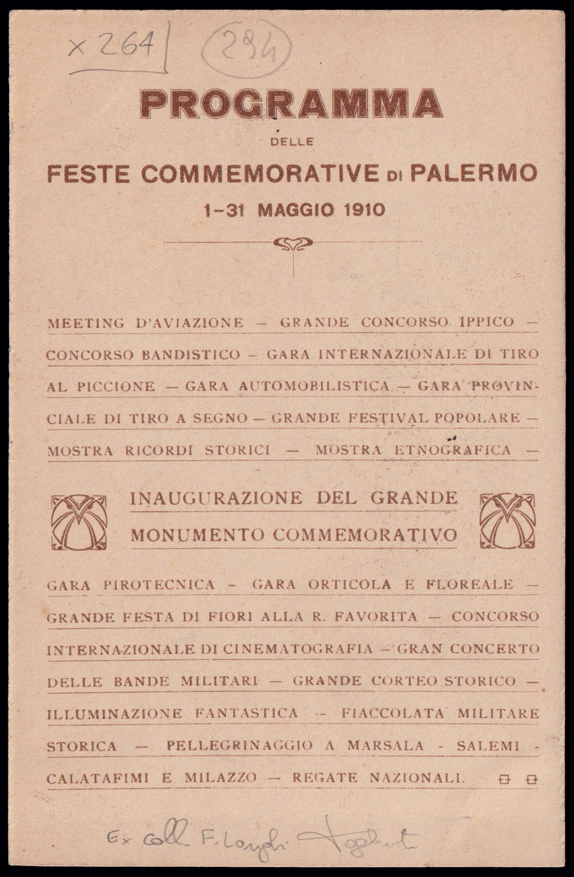 1910 PALERMO / SETTIMANA D' AVIAZIONE. Cartoncino policromo ufficiale con al verso il programma delle feste del cinquantenario, nuova. Longhi 239.