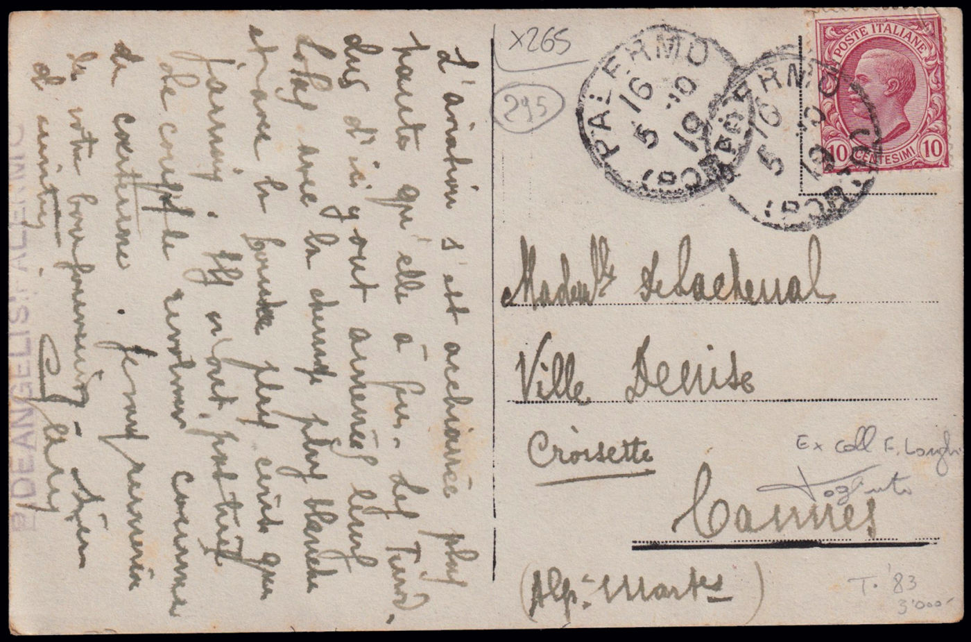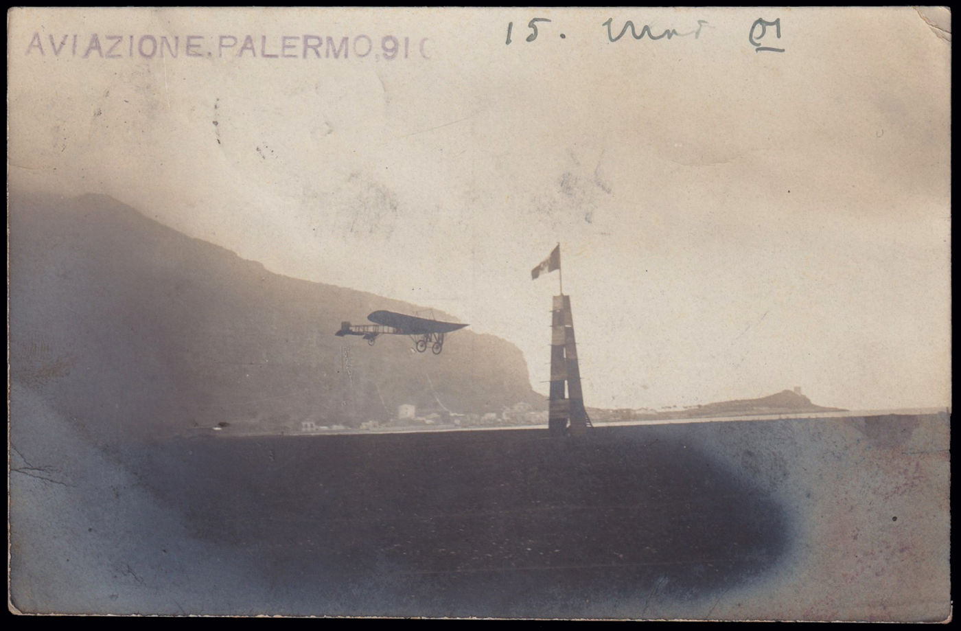 1910 PALERMO / SETTIMANA D' AVIAZIONE. Cartolina fotografica con timbro lineare AVIAZIONE PALERMO 910 in alto a sinistra ed al retro lineare viola P. DE ANGELIS, spedita da Palermo per Cannes il 16/5/1910. Riprodotta a