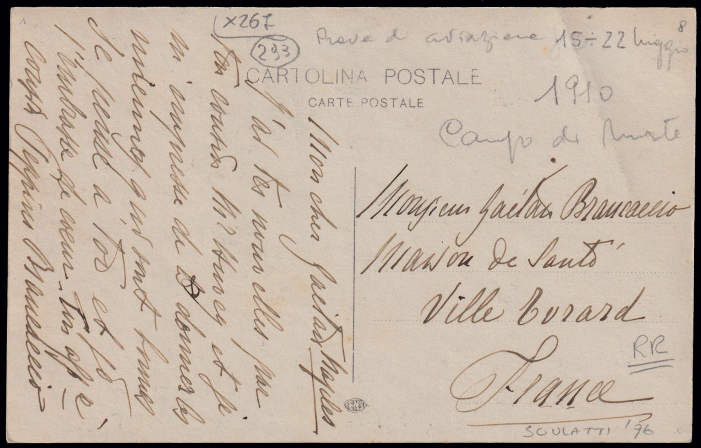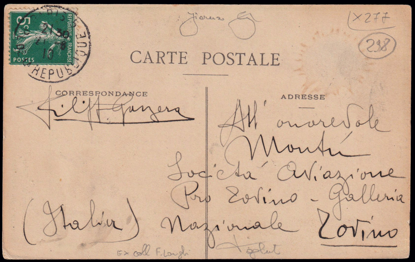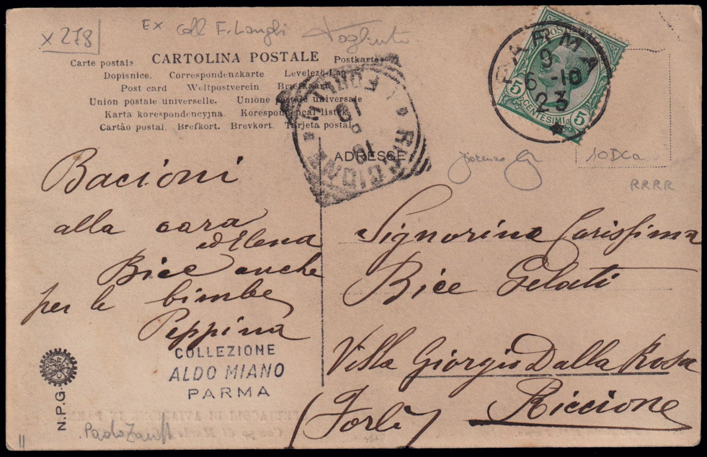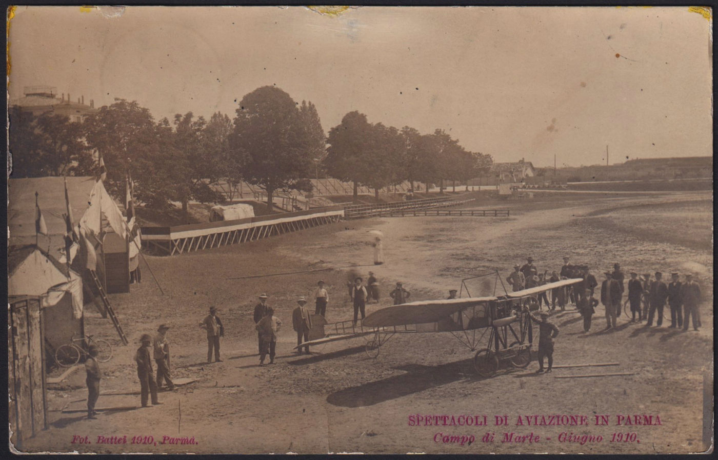 PARMA / Campo di Marte - Giugno 1910), viaggiata da Parma a Riccione il 9/6/1910. Riprodotta a pagina 47 del libro "Aerofilia Italiana - edizione 2007" di F. Longhi. Firma di garanzia F.Longhi e P. Zanetti. Longhi 292. Provenienza: Asta P. Zanetti
