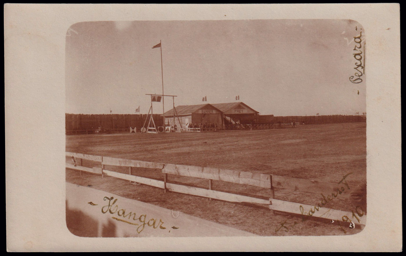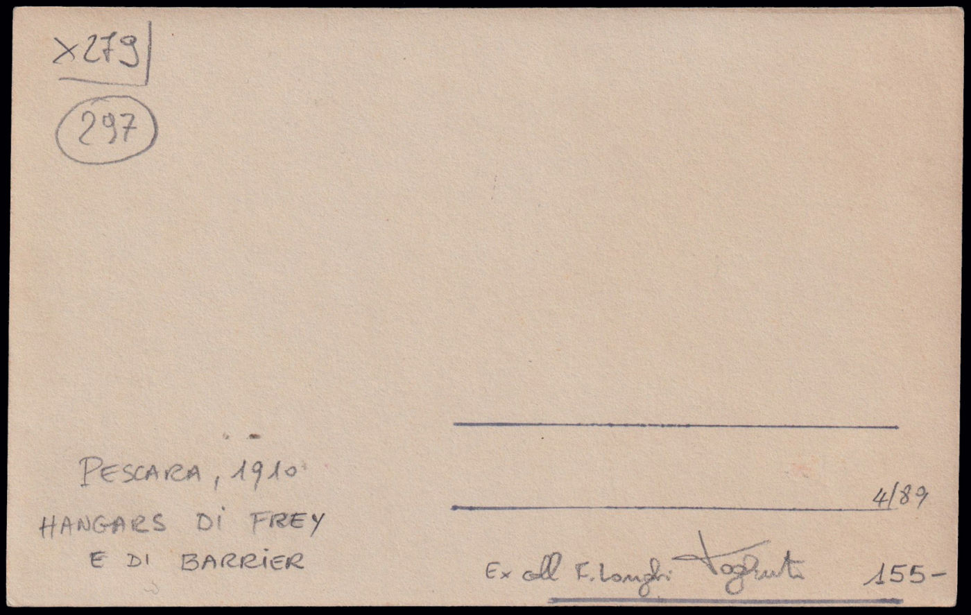 1910 PESCARA / SPETTACOLI D'AVIAZIONE. Rara cartolina fotografica con scritte manoscritte in oro Hangar e Pescara (Fot. T. Landerset 1910, in basso a destra), nuova. Riprodotta a pagina 91 del libro "Aerofilia Italiana