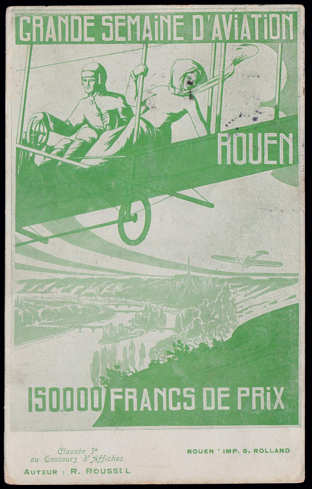 1910 RUEN GRANE SEMAINE D'AVIATION. Cartolina verticale ufficiale verde, viaggiata. Riprodotta a pagina 88 del libro "Aerofilia Italiana - nuova edizione" di F. Longhi. Firma di garanzia F.Longhi. Longhi 293 (nuova