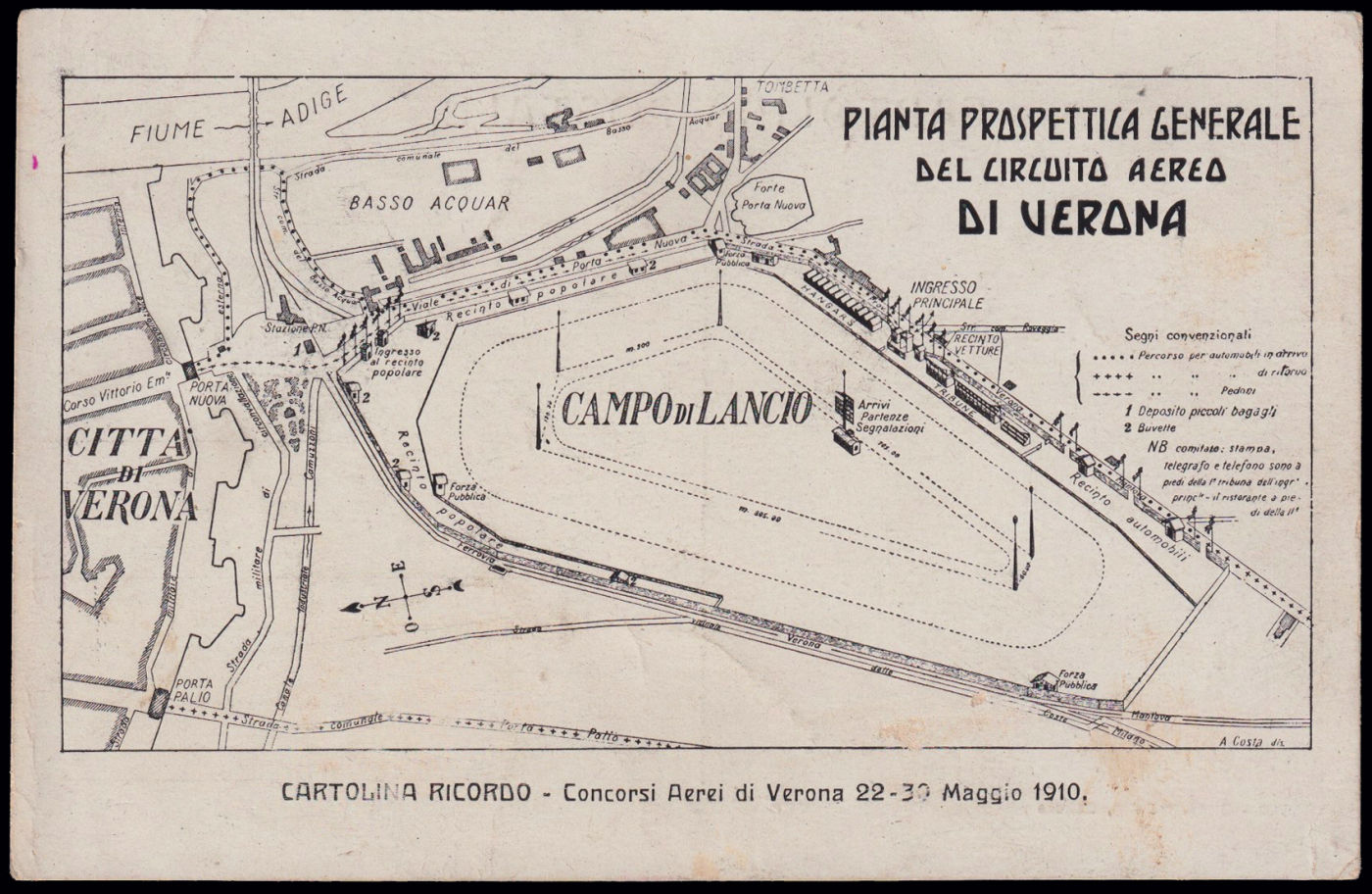 1910 VERONA / CONCORSI AEREI INTERNAZIONALI. Cartolina "Pianta prospettica generale del Circuito aereo di Verona". Longhi 258. Rara. Piccolo strappetto in basso. (Image) (ImageA)