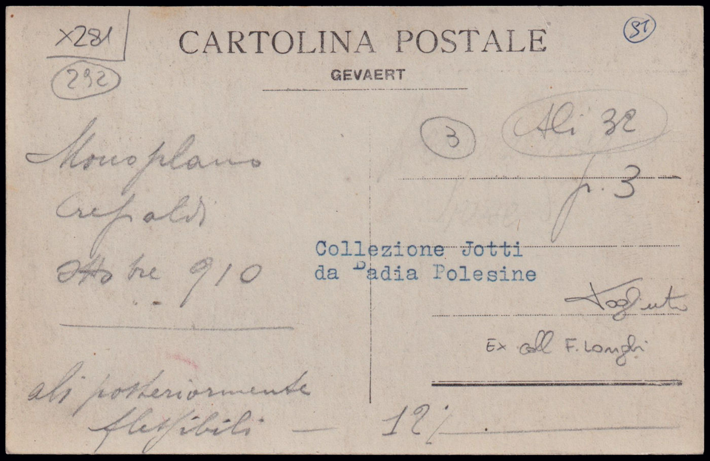 1910 MILANO / PROVE DEL MONOPLANO CAPALDI. Cartolina con vista frontale del monoplano, nuova. Longhi 987. Ex coll. Jotti. Molto rara.