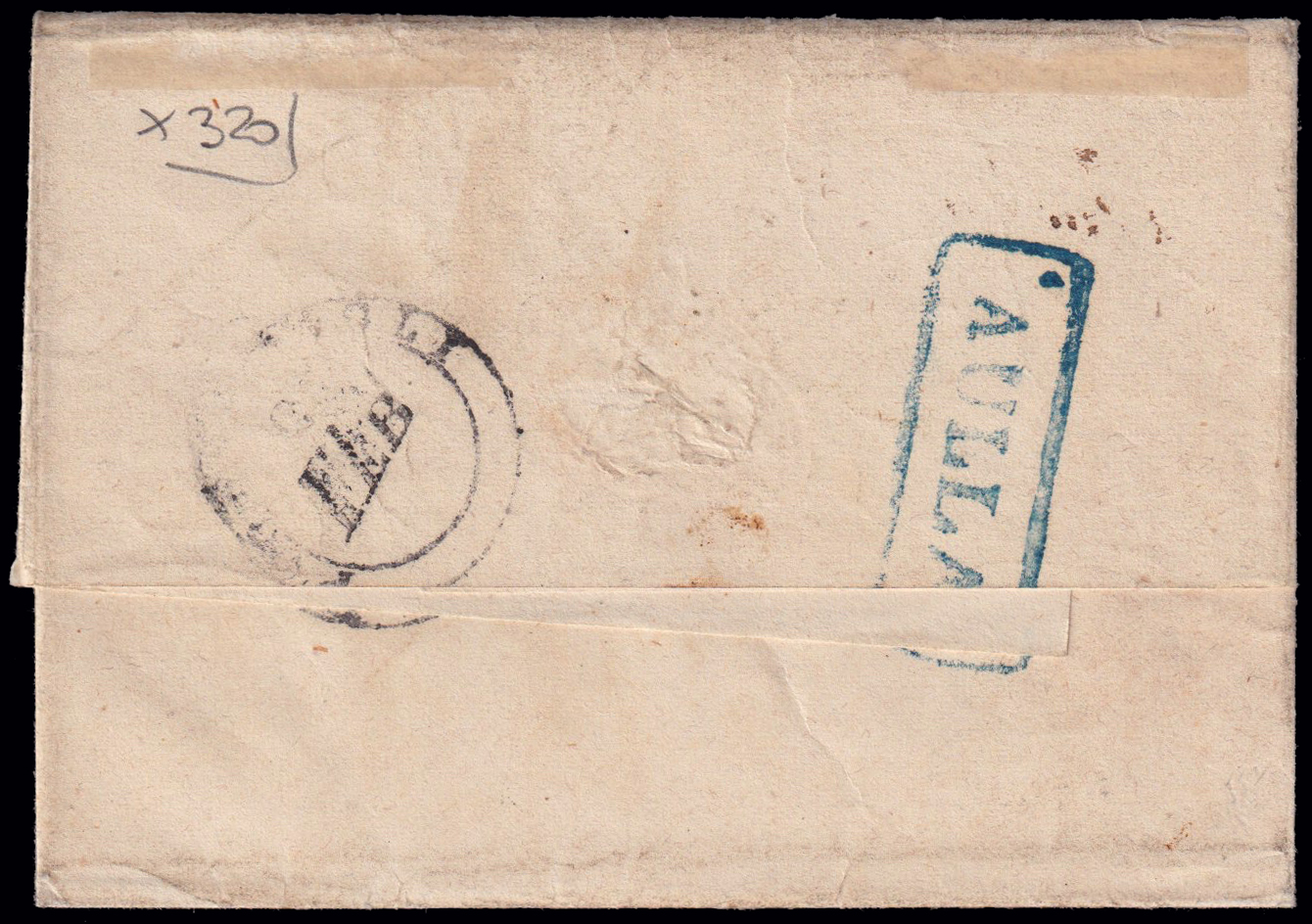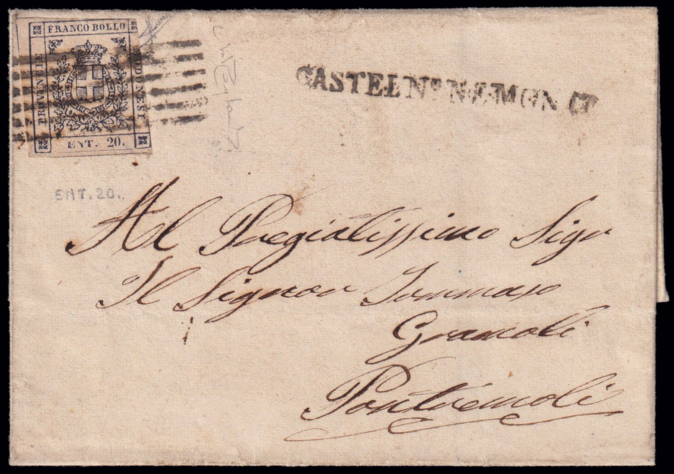 CISAPPENNINO MODENESE - UNO DEI FRANCOBOLLI PROVVISORI CON VARIETA' ENT 20.. Lettera spedita da Castelnuovo ne' Monti per Pontremoli nel febbraio 1860 affrancata con il rarissimo francobollo ardesia con varietà "ENT.