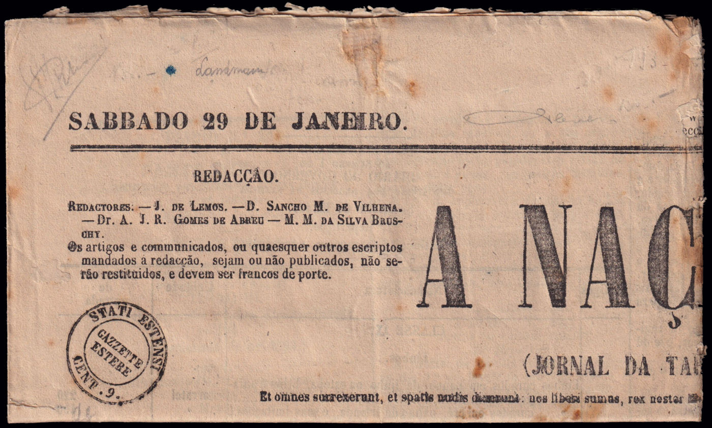SEGNATASSE PER GIORNALI. Copia del giornale portoghese "A NACAO" del 29/1/1853 annullato col timbro "STATI ESTENSI / GAZZETTE ESTERE / CENT.9", ben impresso (Classici d'Italia MRM1, Sassone B1). (Image)