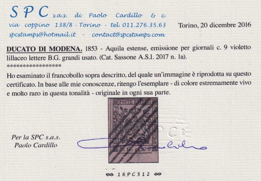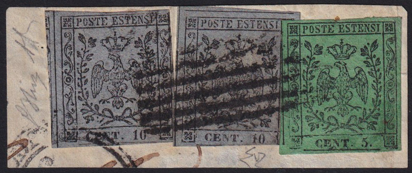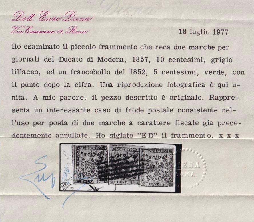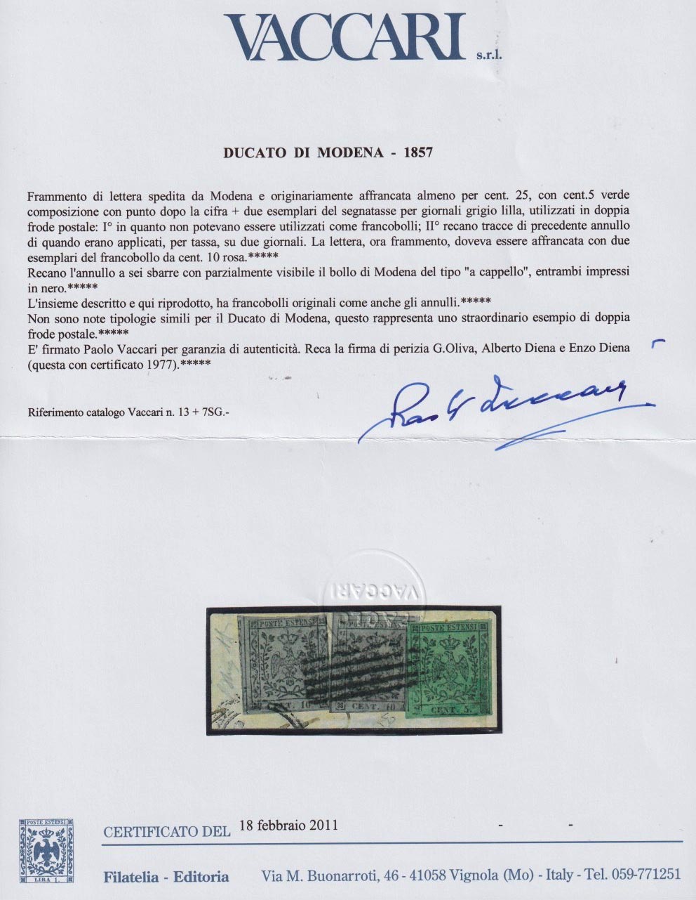riutilizzate per "frode postale" nell'affrancatura di 25 centesimi. Dettagliato certificato "storico" E. Diena (1977) e Vaccari (2011) che scrive "non sono note tipologie simili per il Ducato di Modena, questo rappresenta uno straordinario esempio di
