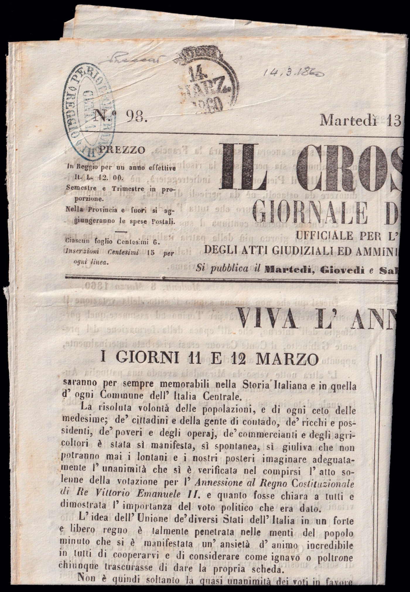 PERIODICI FRANCHI REGGIO C1. Copia del giornale "Il Crostolo" del 13/3/1860 spedito spedito da Modena per Alessandria il 14/3/1860 annullato con il timbro ovale azzurro. All'inteno notizie del Plebiscito del 11 e 12