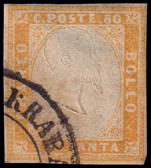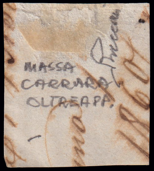 USO DEI FRANCOBOLLI SARDI. Francobollo da 80 centesimi dell'emissione sarda annullato col timbro granducale di Massa Carrara, con tutti i margini bianchi. Firma di garanzia al retro Vaccari. (Image) (ImageA)