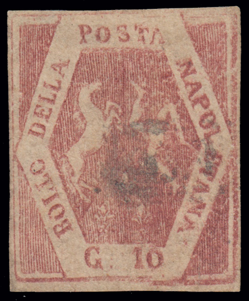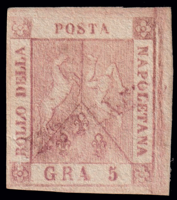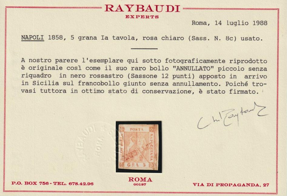 ANNULLO DEL PORTO SICILIANO SU FRANCOBOLLO DI NAPOLI. Francobollo da 5 grana , I tavola, rosa carminio giunto senza annullamento e obliterato col timbro ANNULLATO in rosso brunastro. Dettagliati certificati Raybaudi