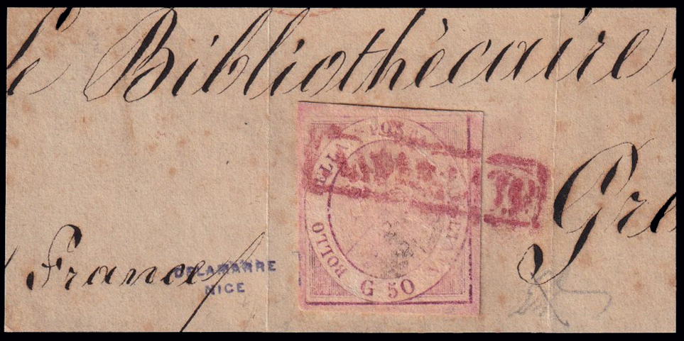 ANNULLO ROSSO SU FRANCOBOLLO DA 50 GRANA. Esemplare ben marginato su grande frammento di lettera diretta a Grenoble e annullata col timbro in cartella impresso in inchiostro rosso. Dettagliato certificato E. Diena e