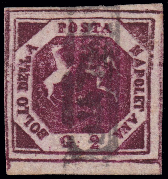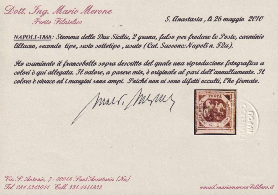FALSI PER FRODARE LA POSTA. Francobollo da 2 grana II tipo, viola lilla, con annullo in cartella che presenta una ben visibile DOPPIA STAMPA, nitida nelle parole "DELLA" e "NAPOLETANA". Firma di garanzia A. Diena e