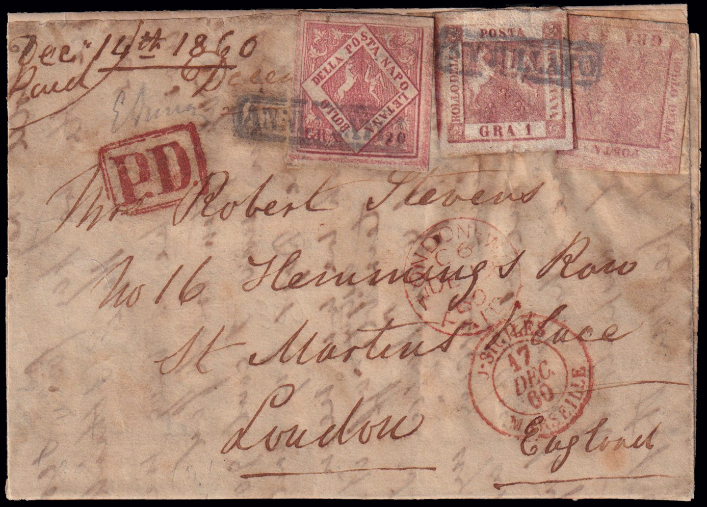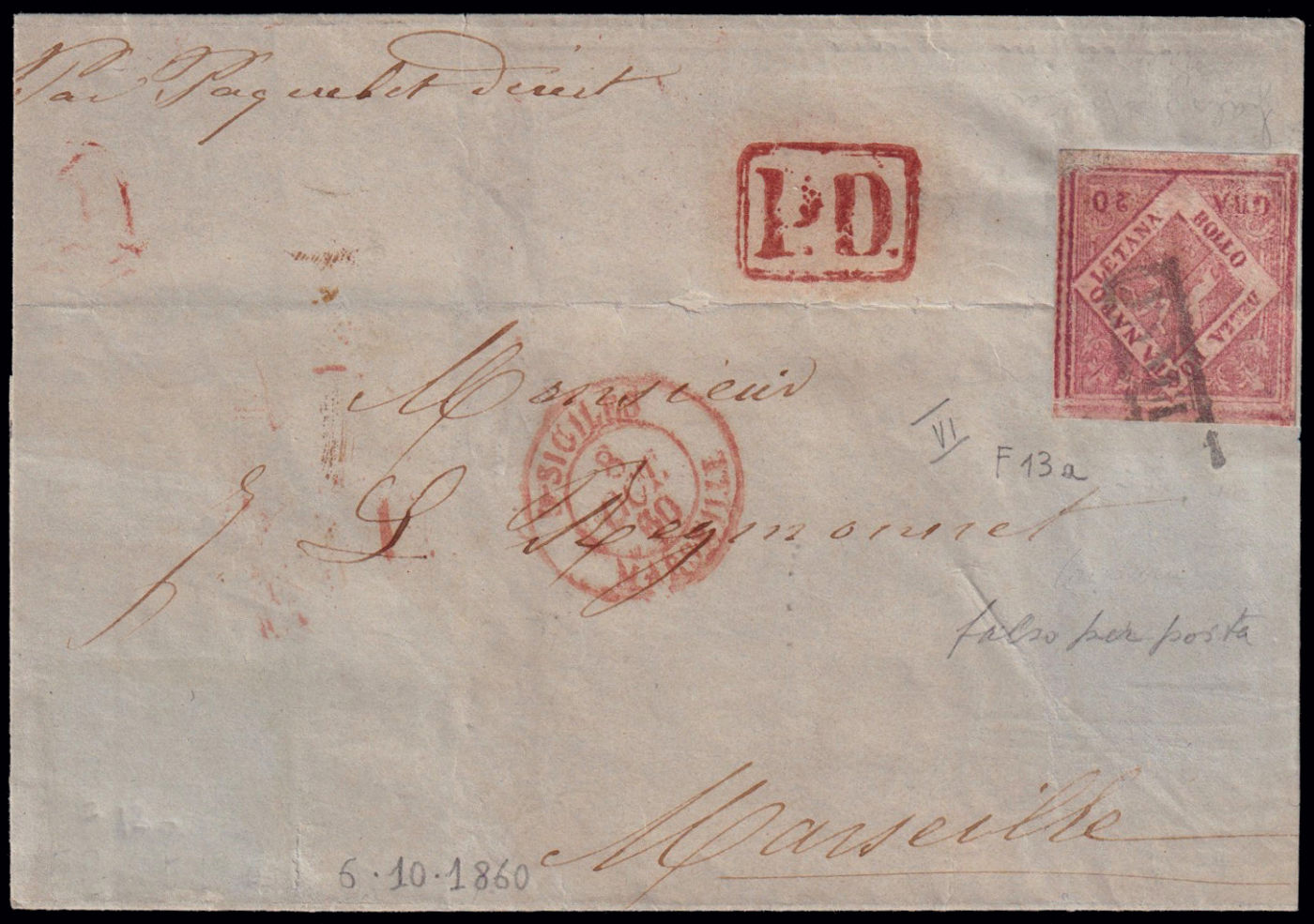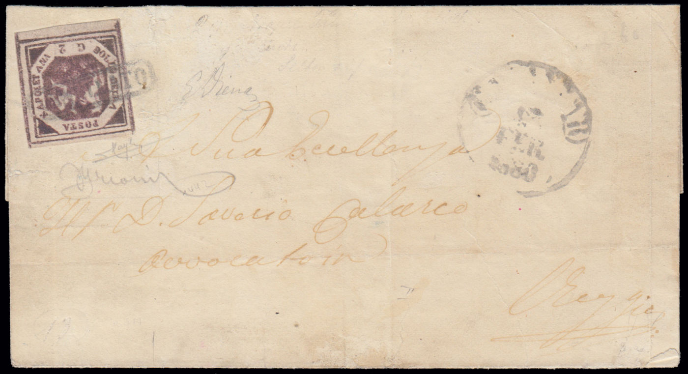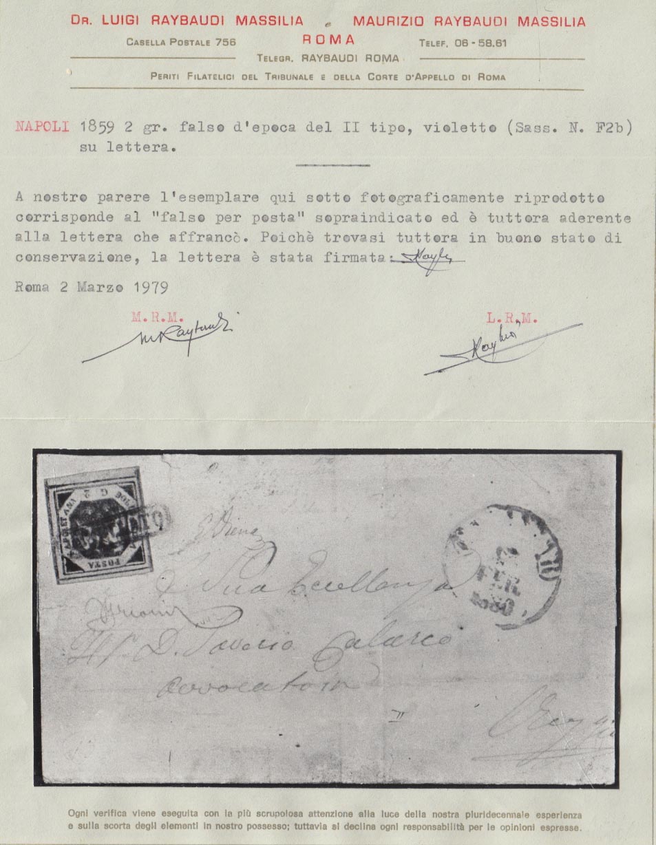 FALSI PER FRODARE LA POSTA. Lettera spedita il 2/2/1860 per Reggio ed affrancata con il francobollo da 2 grana falso d'epoca del II tipo violetto (Classici d'Italia NAF3, Sassone F2b). Firme di garanzia Em.Diena,