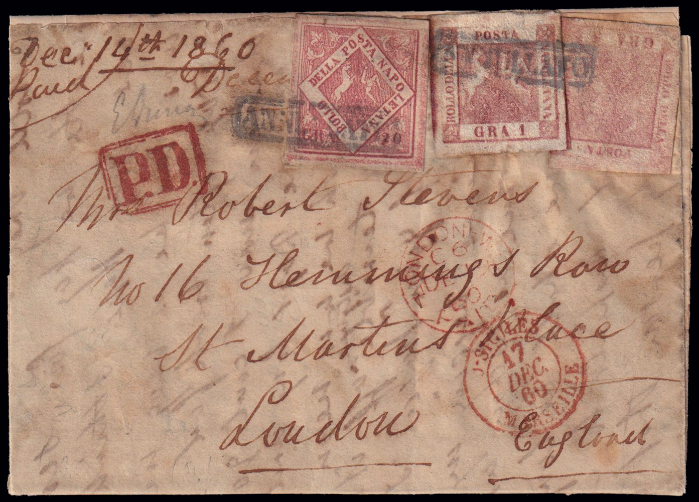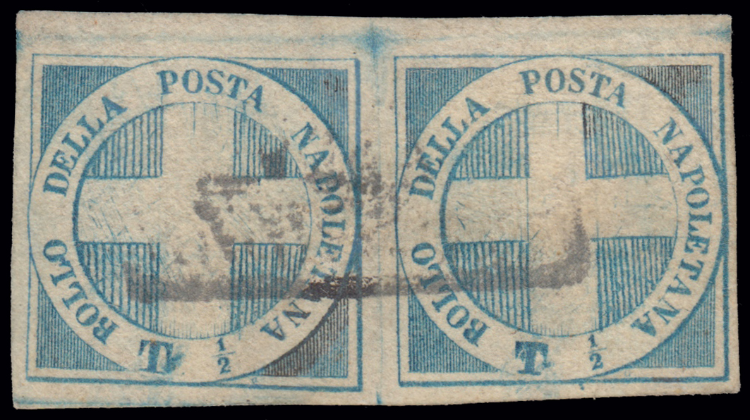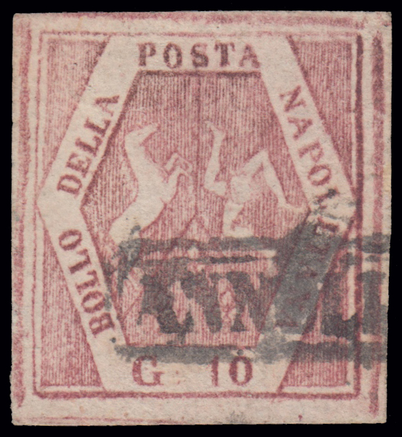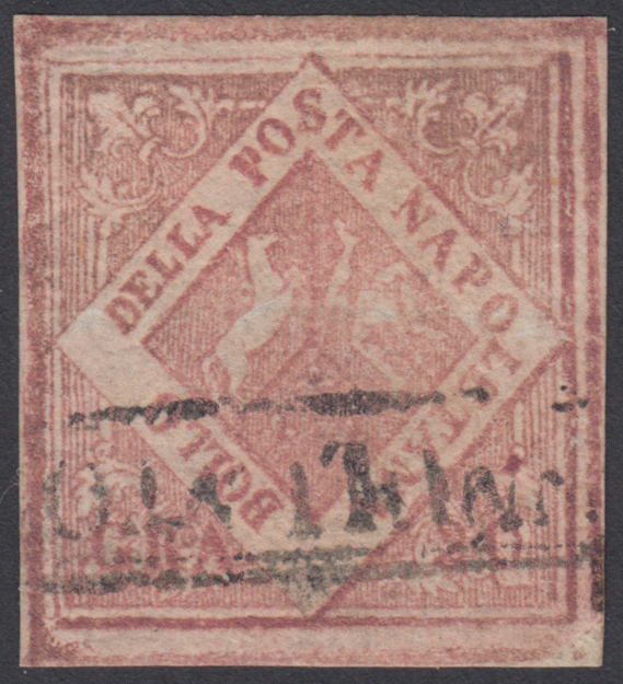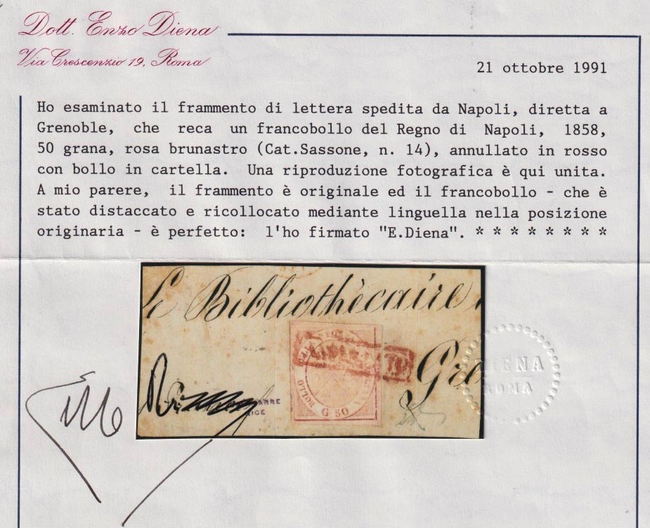 verticale del francobollo di Napoli da 2 grana III tipo carminio, annullati col raro timbro a "svolazzo" del tipo 12 (Classici d'Italia 24+NA3d, Sassone 7d+21a). Timbro di arrivo al retro. Dettagliato certificato fotografico Diena e firma di garanzia