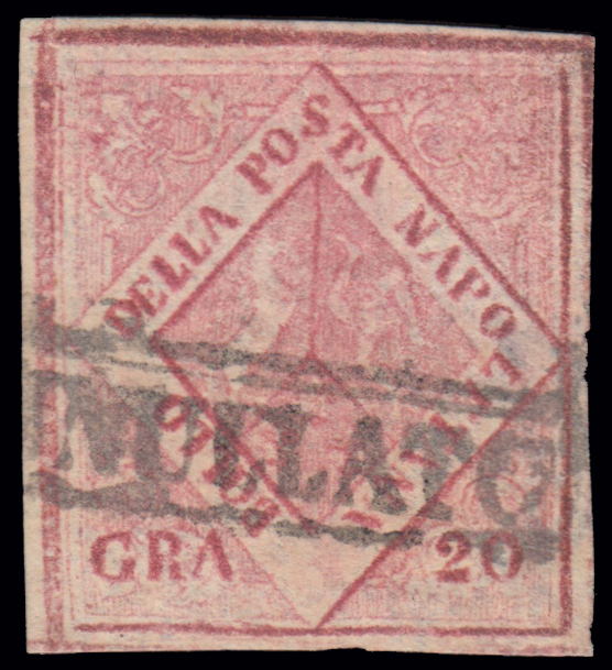 FALSI DELL'EPOCA PER FRODARE LA POSTA. Francobollo da 20 grana imitazione dell'epoca del V° tipo calcografico di Napoli, carminio su carta vergata (Sassone F12b, Classici d'Italia NAF6), annullato. Dettagliato
