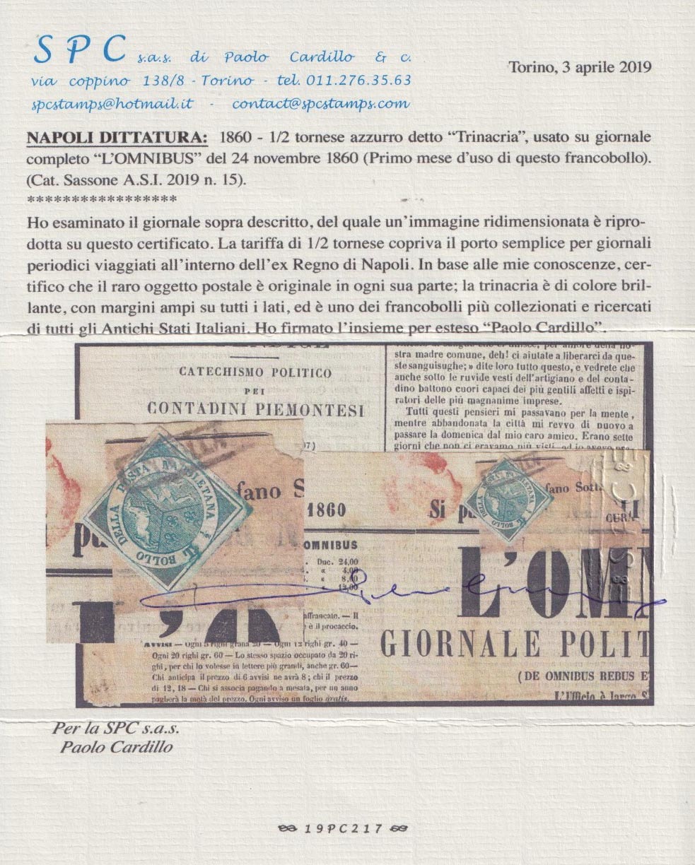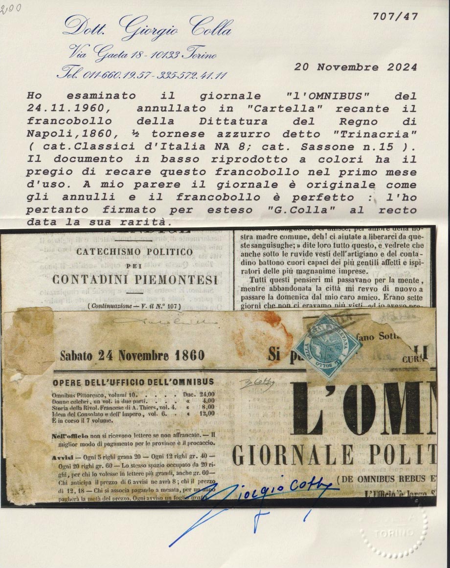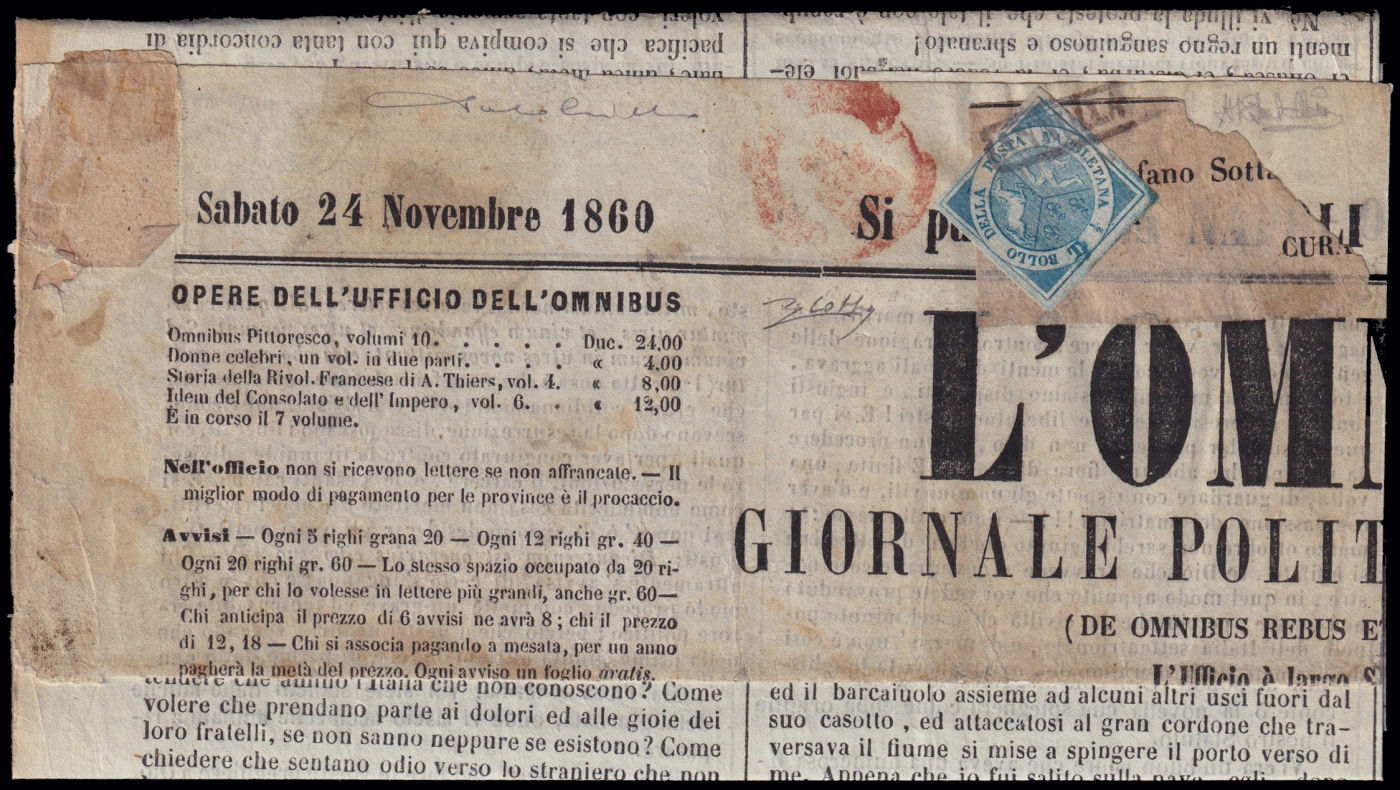 DITTATURA. Pagina del giornale l'Omnibus del 24/11/1860 annullato in cartella e recante il raro francobollo da 1/2 tornese azzurro con "Trinacria" al centro (Classici d'Italia NA8, Sassone 15), nel primo mese d'uso.