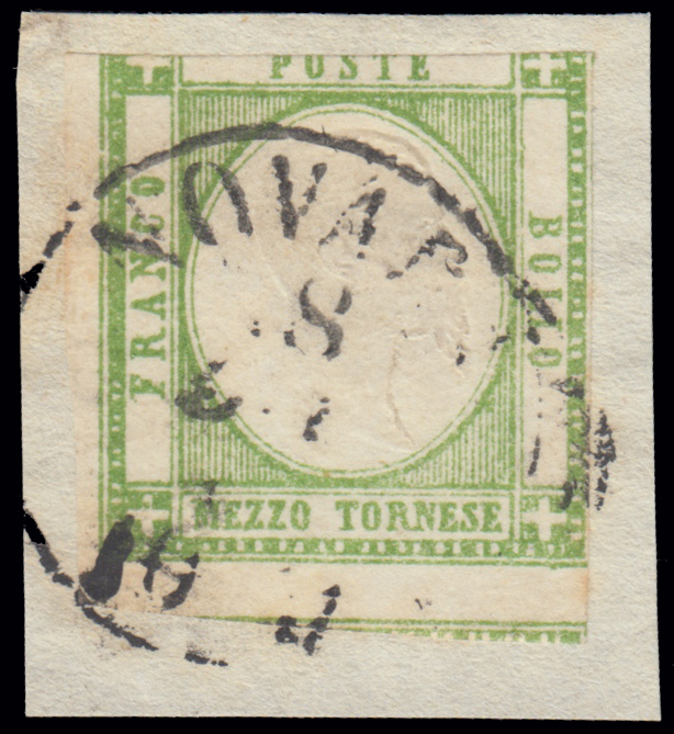 PROVINCIE NAPOLETANE - USO A NOVARA. Frammento di lettera affrancata con il francobollo delle Provincie Napoletane da 1/2 tornese verde giallo (Sassone 17e, Classici d'Italia 20), difettoso in alto, annullato con il