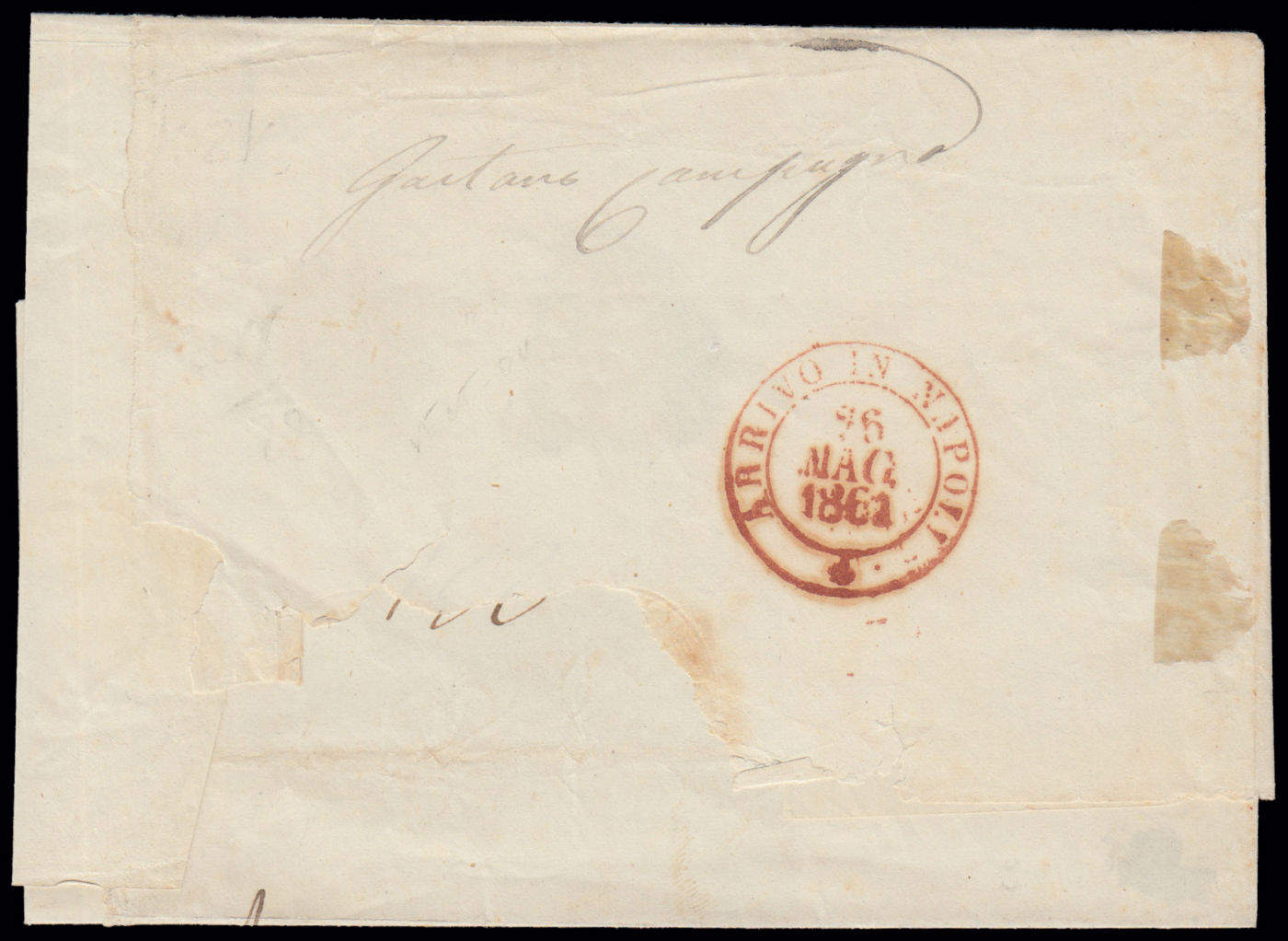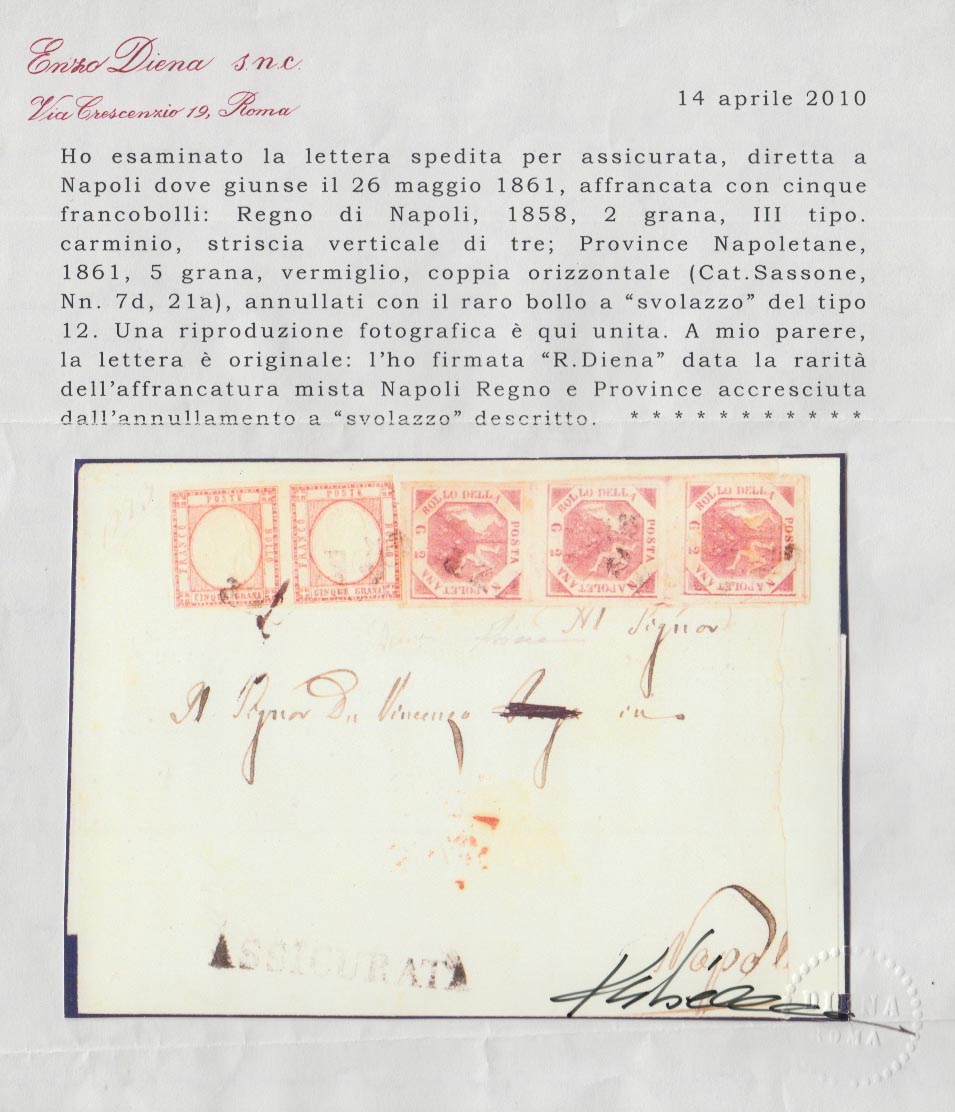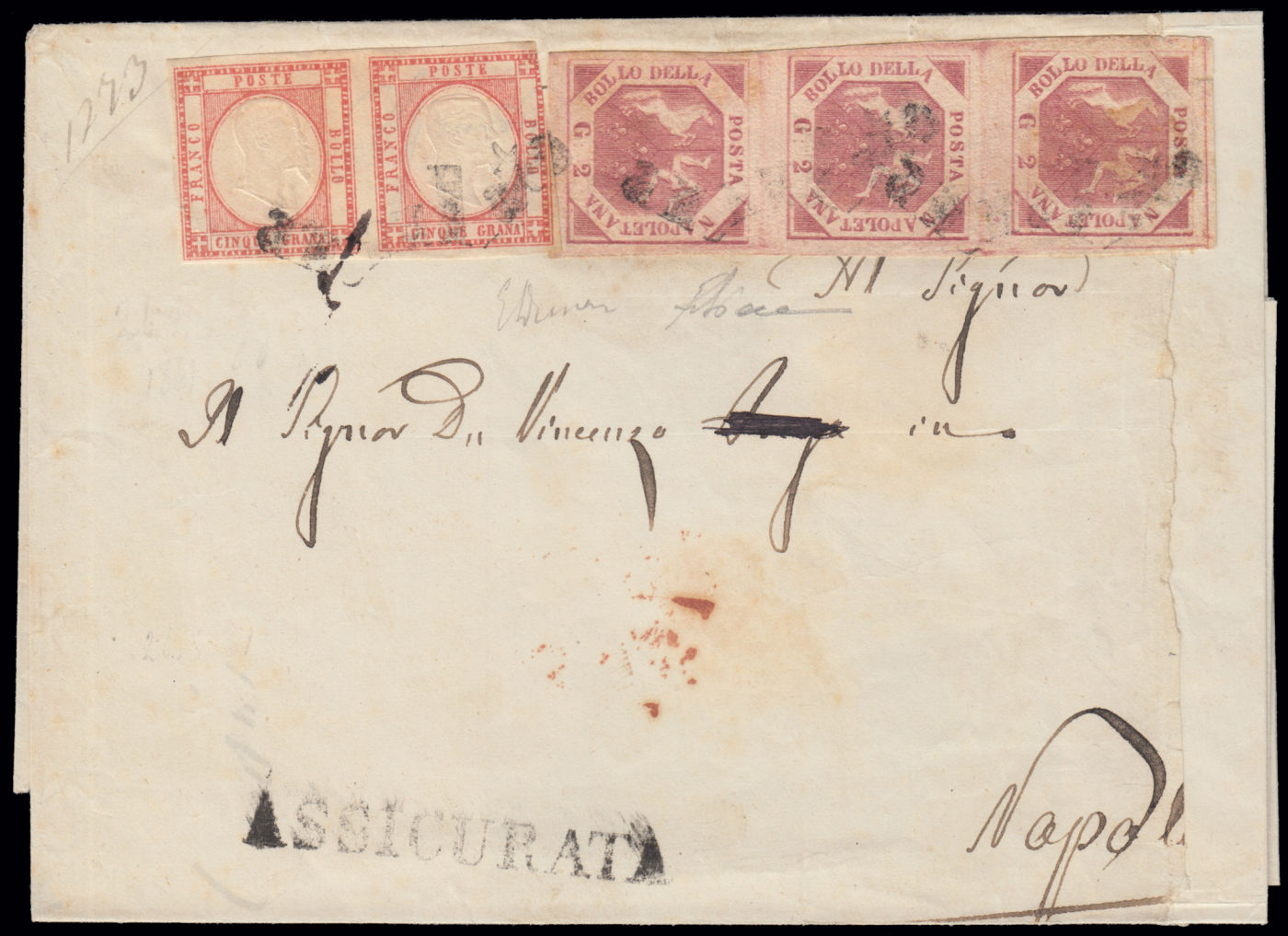PROVINCIE NAPOLETANE - AFFRANCATURA MISTA. Sovracoperta di lettera assicurata, non completa nella parte destra, diretta a Napoli il 26/5/1861 ed affrancata con coppia del francobollo da 5 grana vermiglio e da striscia