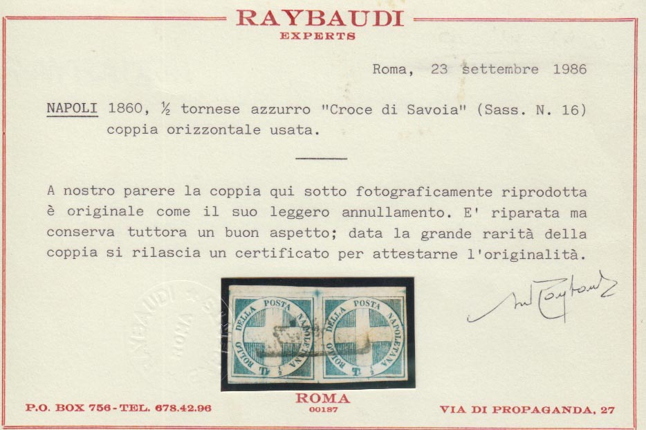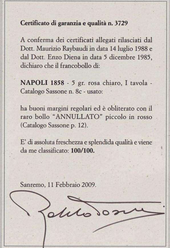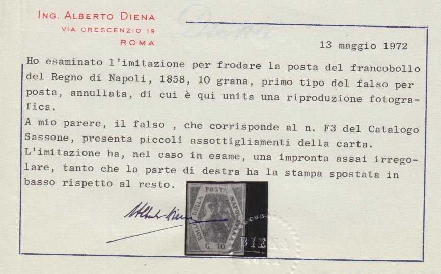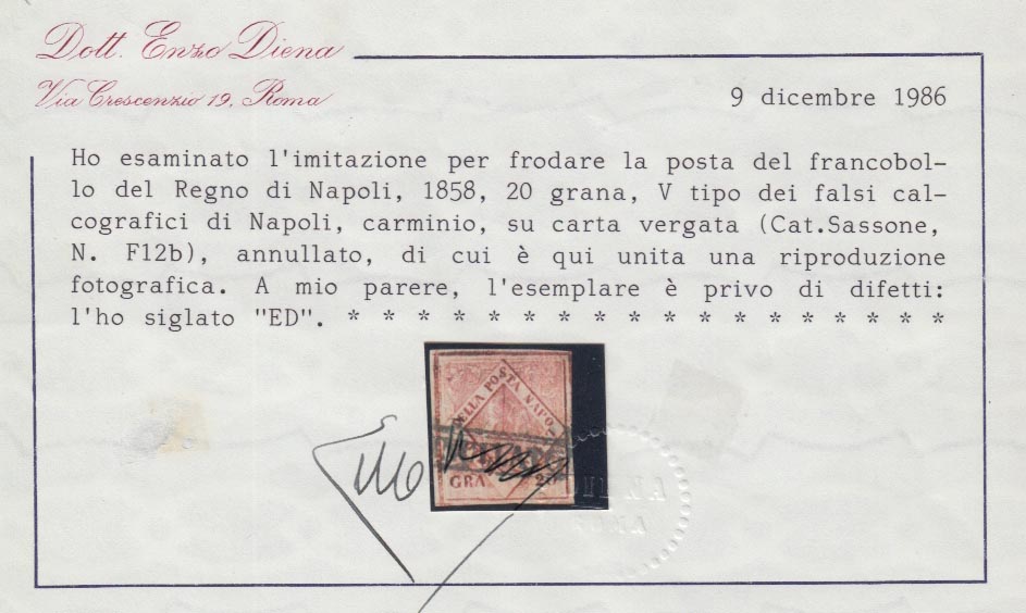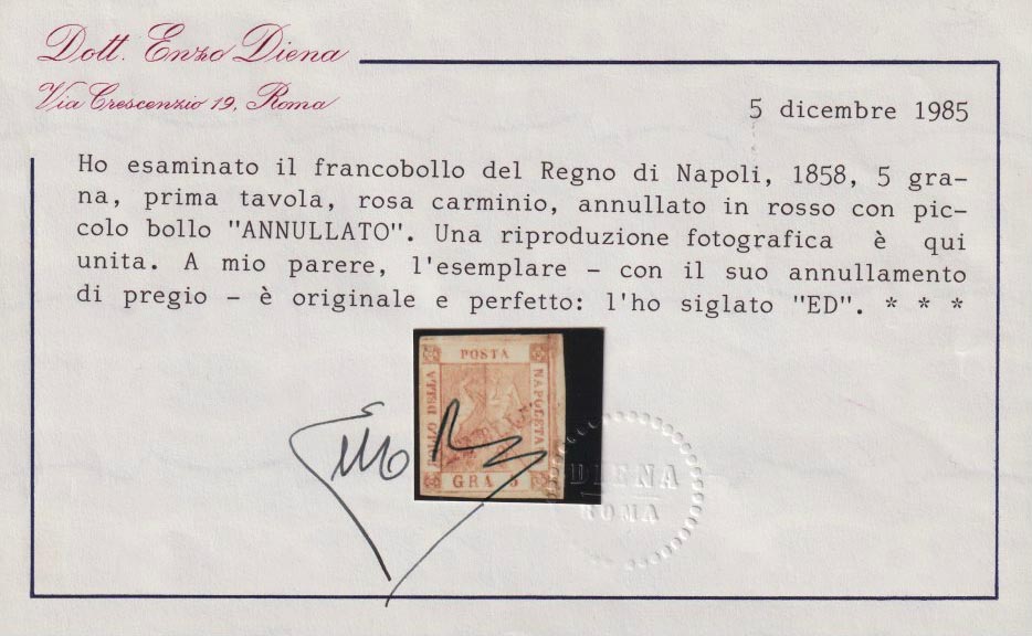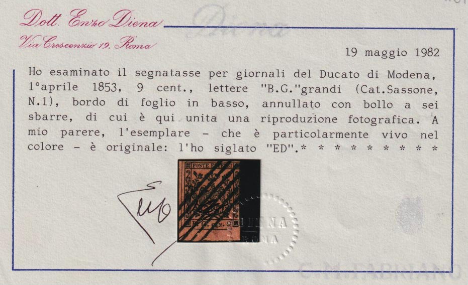dal dettagliato certificatio "storico" E. Diena (1982). (Image) (ImageA)