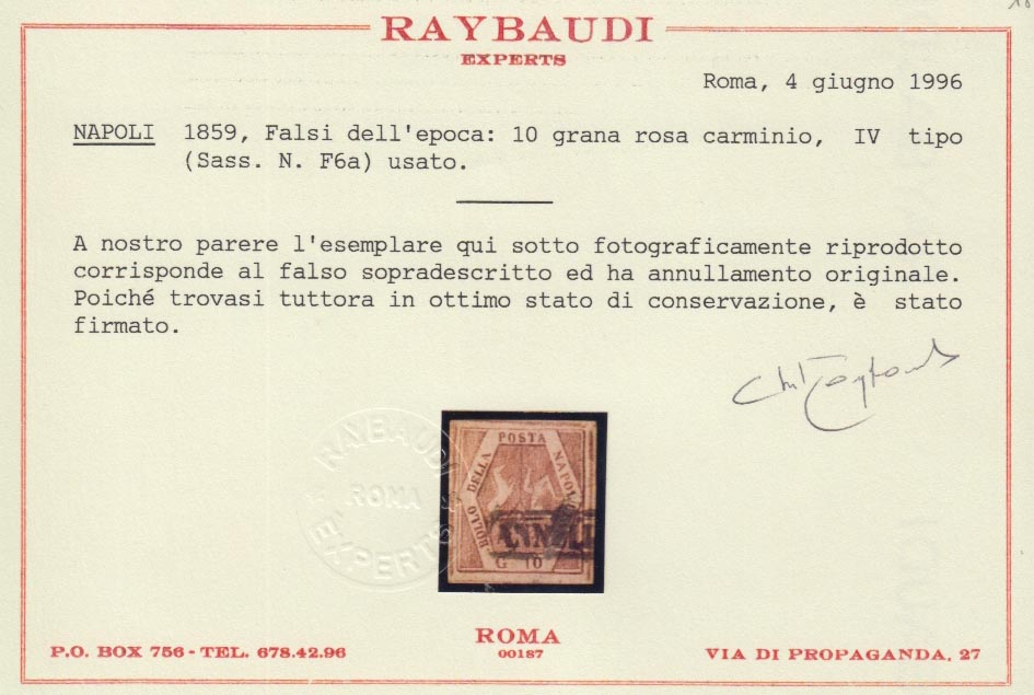 FALSI PER FRODARE LA POSTA. Francobollo da 10 grana rosa carminio falso d'epoca del IV tipo, annullato (Classici d'Italia NAF5, Sassone F6a). Dettagliato certificato Raybaudi (1996) e firme di garanzia A. Diena e G.
