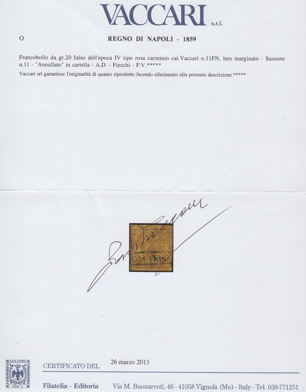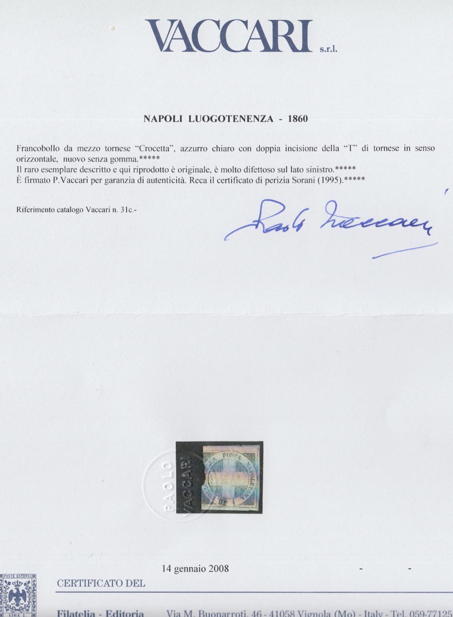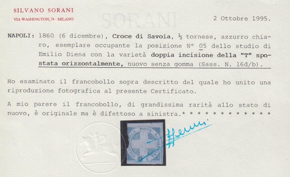 secondo lo studio di Em. Diena (Classici d'Italia NA9a, Sasone 16d), difettoso, nuovo senza gomma. Dettagliati certificati di garanzia di autenticità Sorani (1995) e Vaccari (2008). (Image) (ImageA)