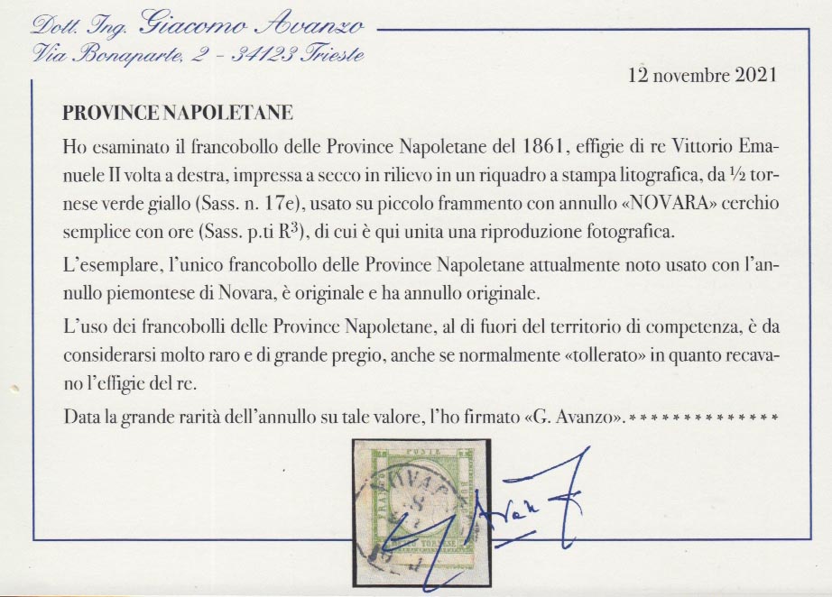 timbro di Novara (sassone p. R3). Dettagliato certificato Avanzo (2021). (Image)