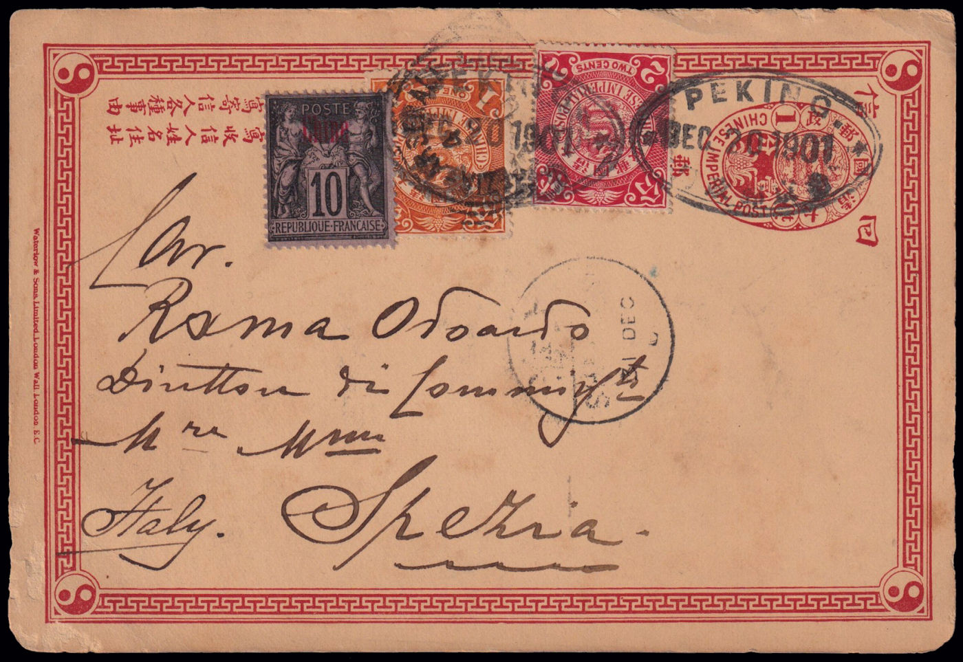 421 image1901 UFFICIO FRANCESE. Cartolina postale da 1 cent. spedita da Pechino via Shanghai per La Spezia (Italia) il 20/12/1901 con affrancatura aggiunta tricolore mista composta da 1cent. e 2 cent. Dragone ed un francobollo dell'ufficio francese da 10 centesimi. (Image) (ImageA)