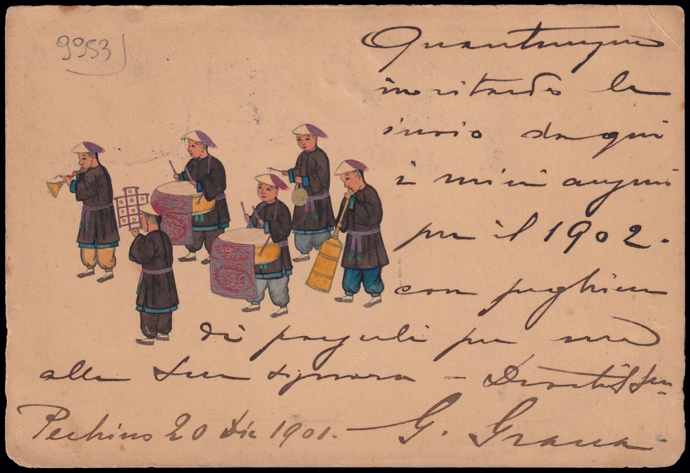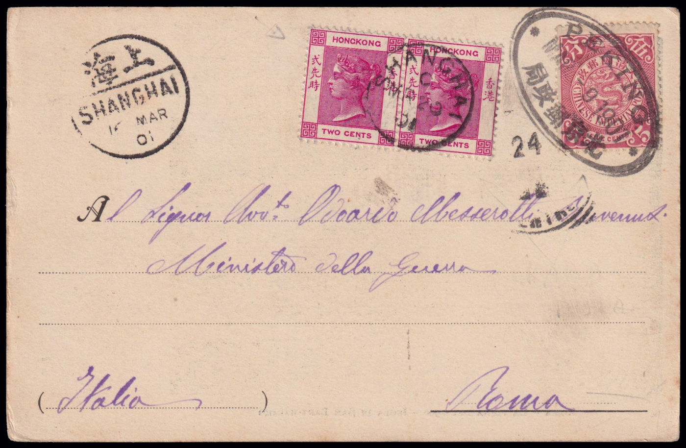 422 L imageGUERRA DEI BOXER. Cartolina spedita da Pechino via Shanghai per Roma il 9/3/1901 con affrancatura mista Hong Kong 2c. (coppia) e 5c. Dragone. Timbro di arrivo in data 24... (Image) (ImageA)