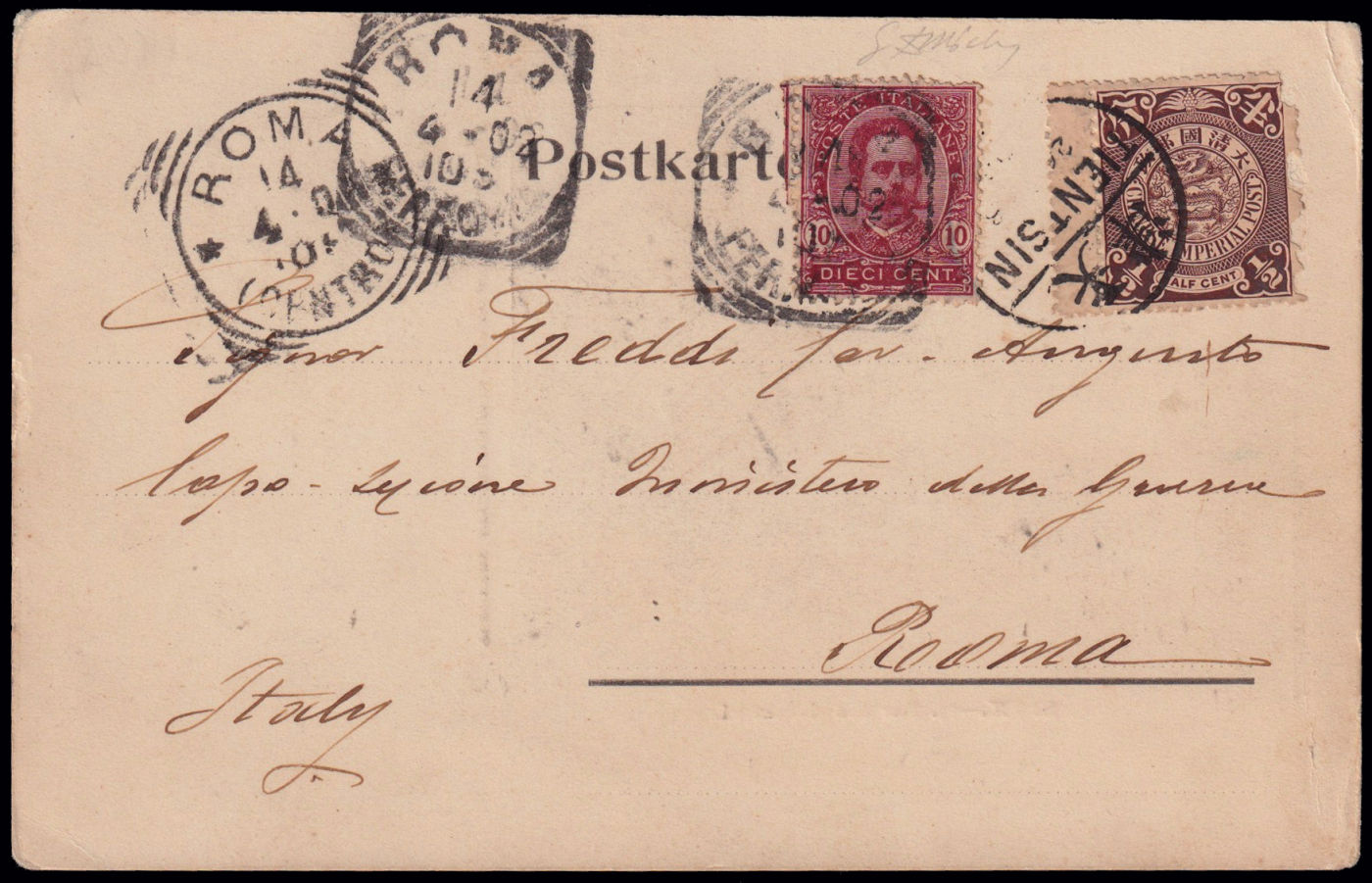 424 L image1902 TIENTSIN. Cartolina spedita in data 24/2/1902 per Roma affrancata con francobollo di Cina da 1/2 cent. e riaffrancata in arrivo a Roma con francobollo di Umberto I centesimi 10 annullato in data 14/4/1902. (Image) (ImageA)