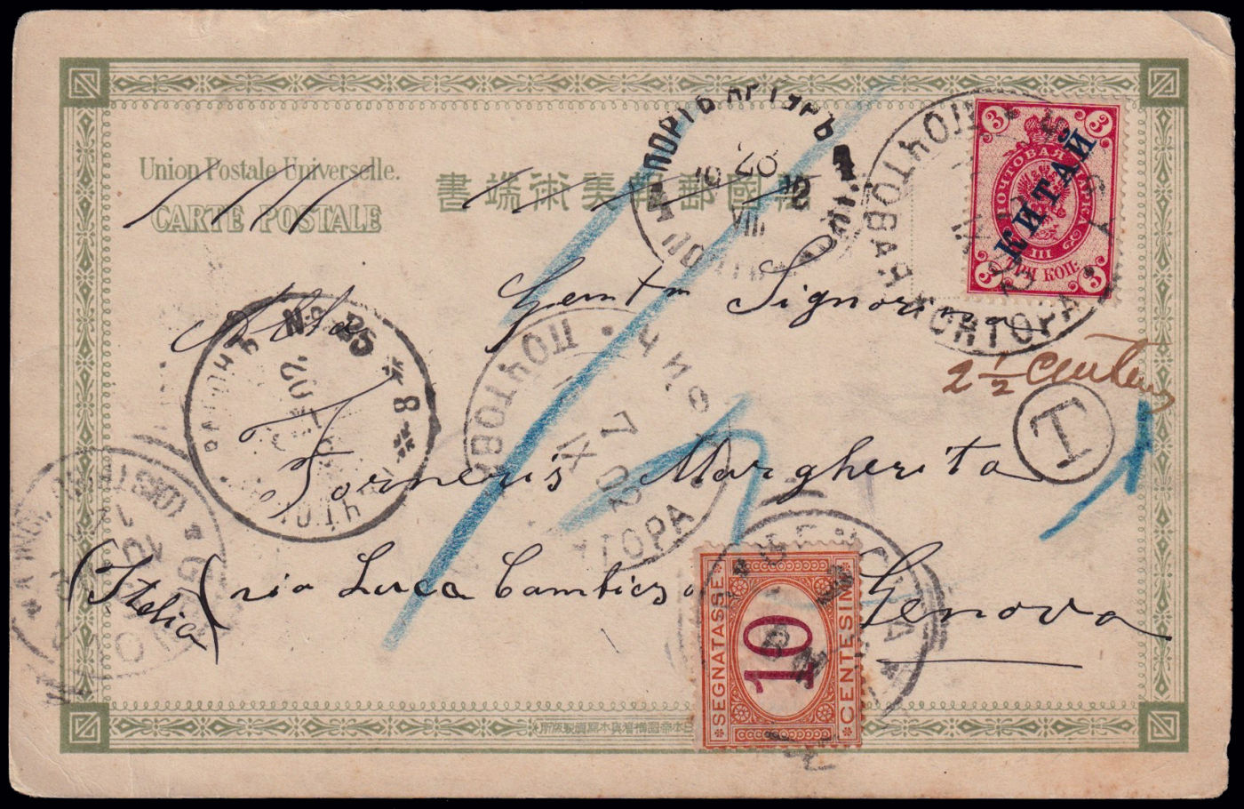 425 L imageUFFICI POSTALI RUSSI IN CINA. Cartolina postale affrancata con francobollo soprastampato da 3 k. annullato "Chefoo 7/9/1902" e tassata 2 1/2 centesimi, diretta a Genova e li tassata con segnatasse da 10 centesimi. Timbro "Port Artur 4" e timbro ferroviario N° 25. (Image) (ImageA)