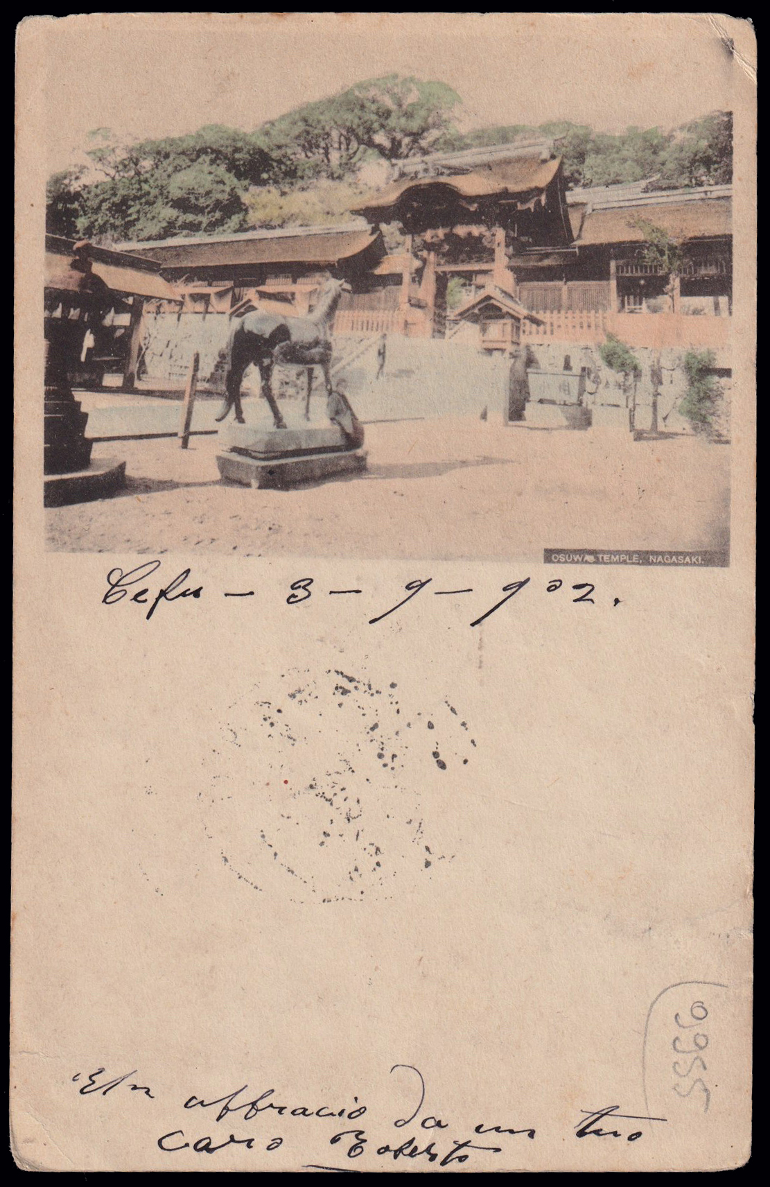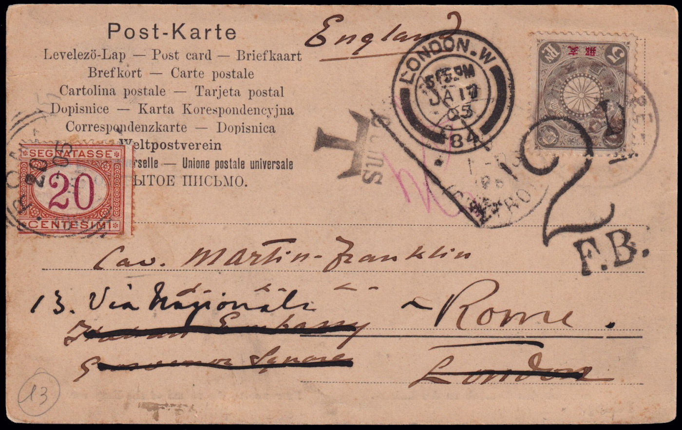 426 imageOCCUPAZIONE GIAPPONESE IN CINA. Cartolina di Pechino affrancata con francobollo giapponese da 5r. annullato col timbro "Peking.17/1/1905". Diretta a Londra e rispedita a Roma dove venne tassata con segnatasse da 20 centesimi. (Image) (ImageA)