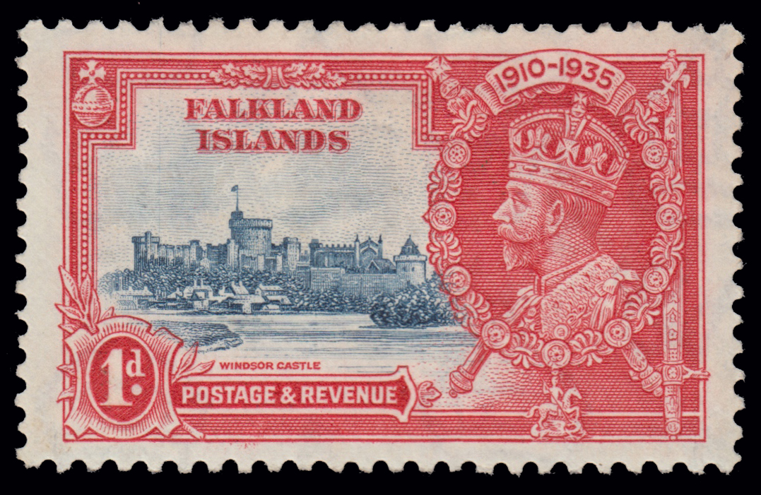 434 Z image1935 SILVER JUBILEE VARIETY. 1 d. deep blue & scarlet HAIRLINE VERTICAL UP FROM LEFT TURRET (SG 139), unused with original gum, mounted. (Image) (ImageA)