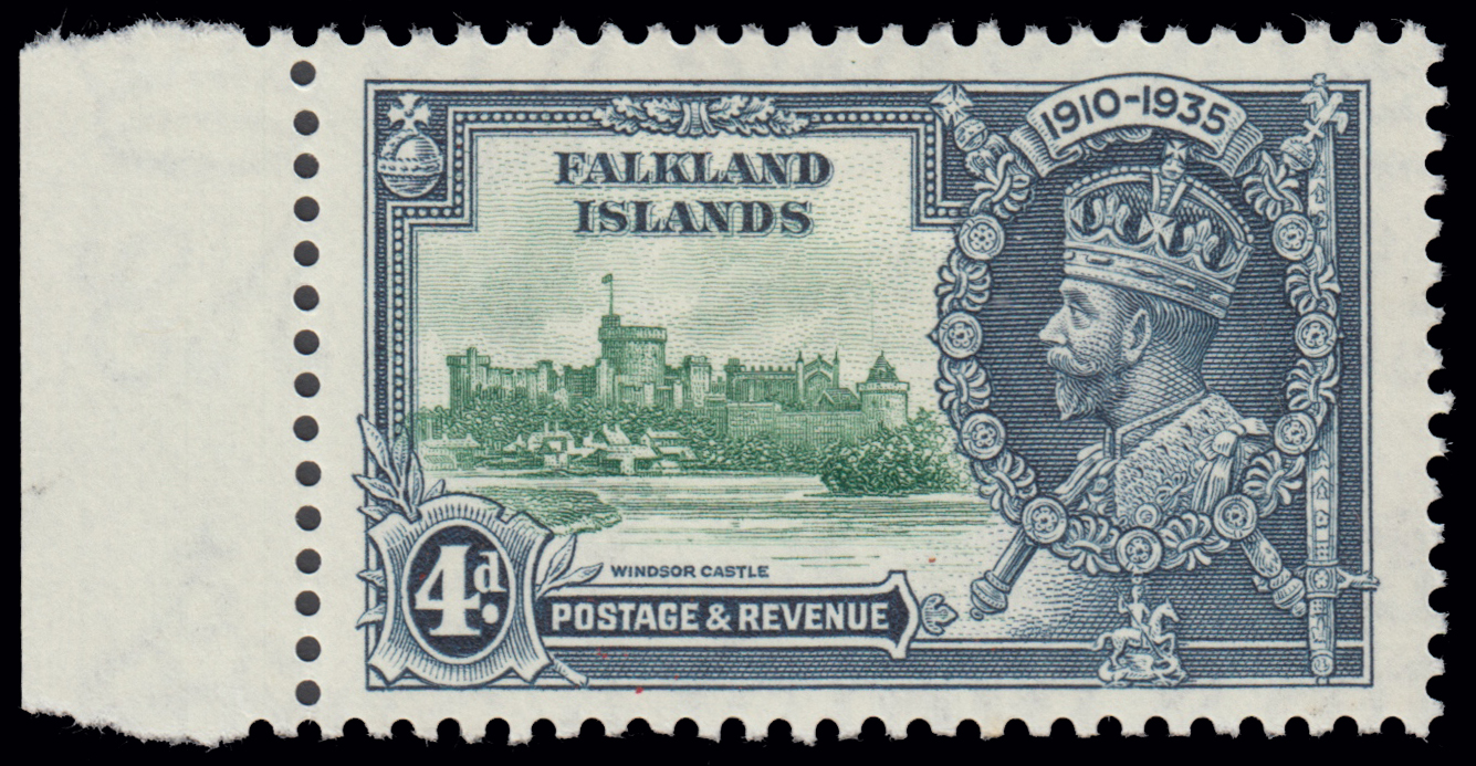 436 Z image1935 SILVER JUBILEE VARIETY. 4d. green & indingo FLAGSTAFF ON RIGHT HAND TURRET (SG 141d), unused with original gum, mounted. Very fine and scarce. (Image) (ImageA)