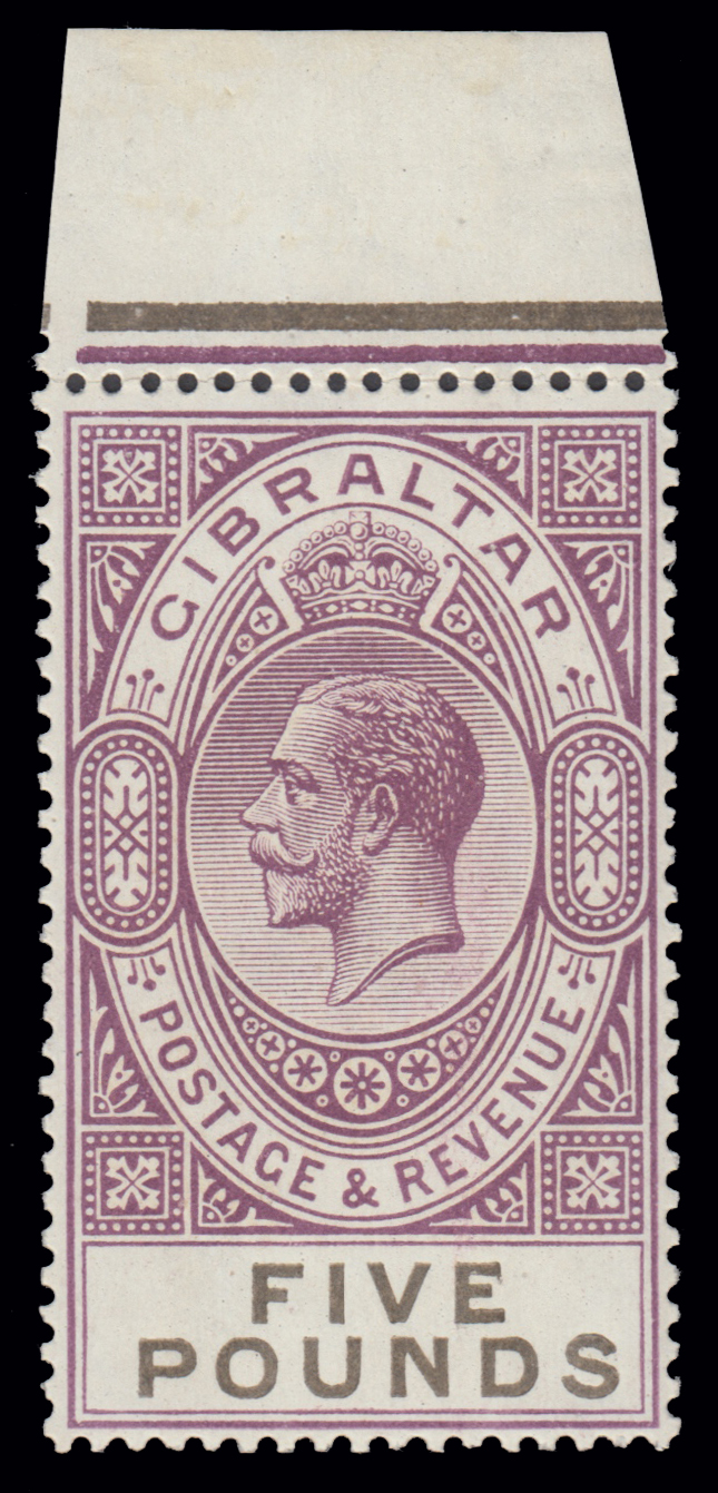 437 G image1925/32 KING GEORGE V. £5 violet & black top marginal, unused vivid colour, neatly centred, with original gum, unmounted. Very fine. (Image) (ImageA)