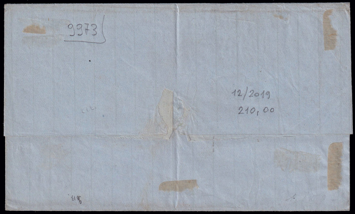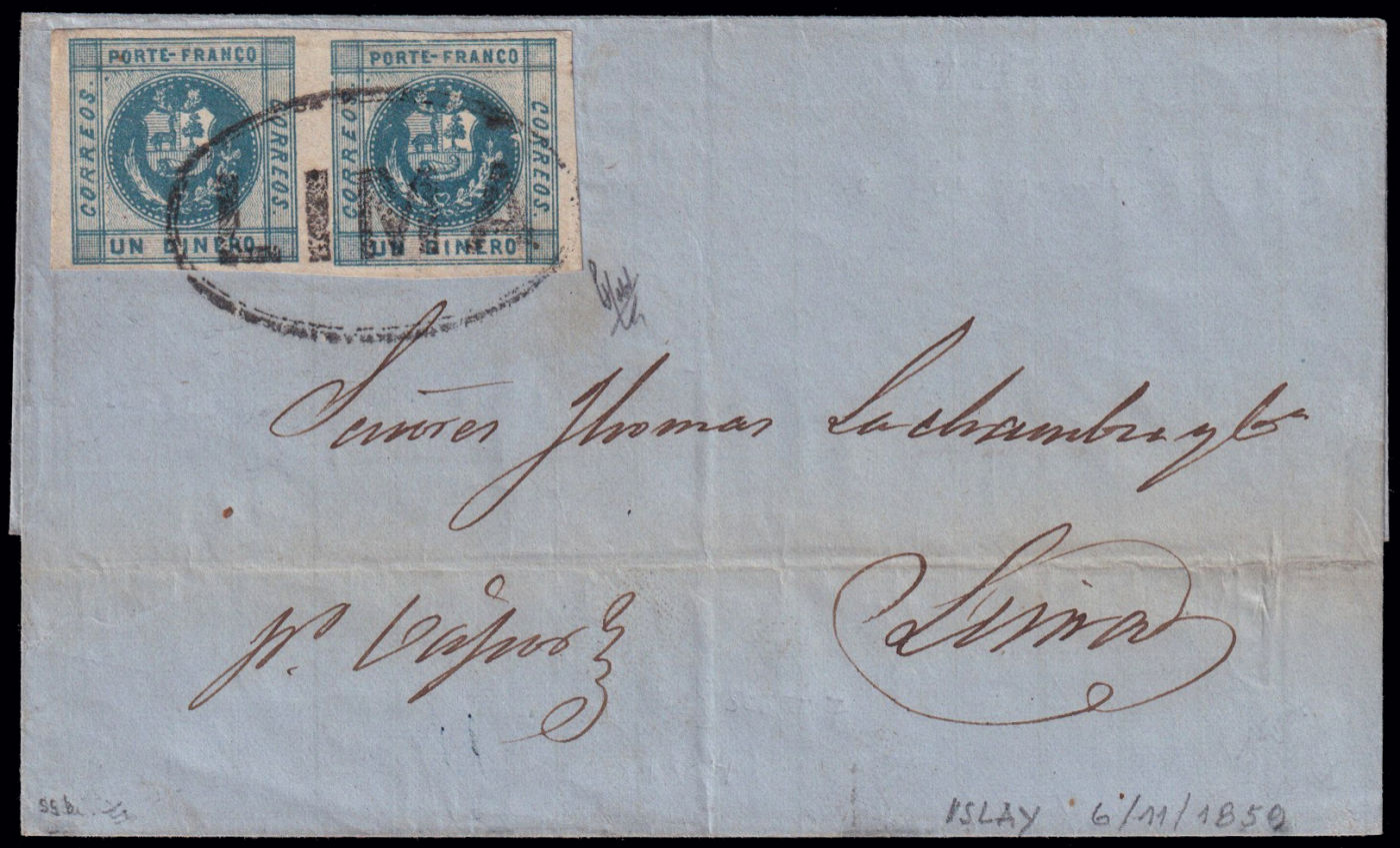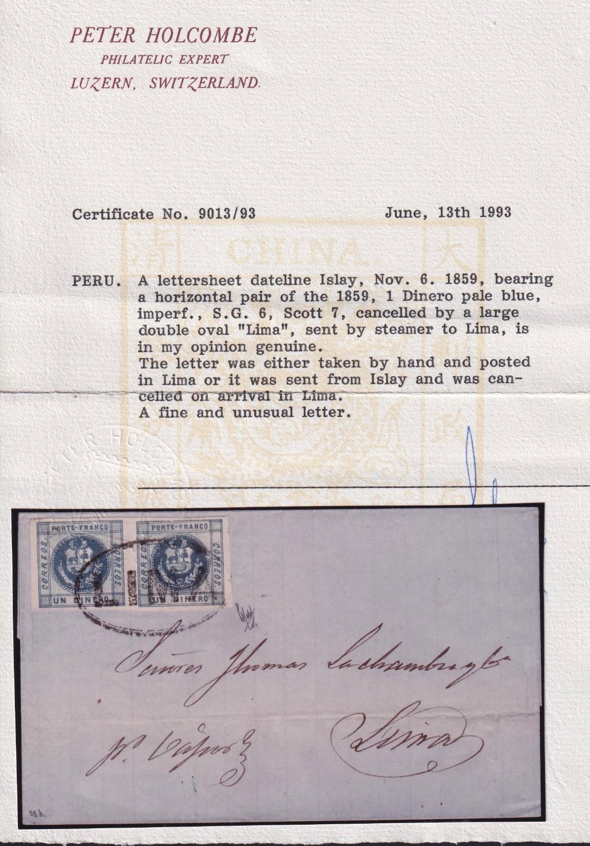 440 L image1858 COAT OF ARMS - LARGE LETTERS. Lettersheet dateline Islay Nov. 6 1859 bearing a horizontal pair of the 1 d. pale blue (S.G. 6) cancelled by large double oval "LIMA", sent by steamer to Lima. Cert. Holcombe, (Image) (ImageA) (ImageB)