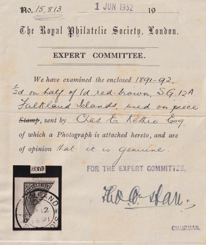 429 F image1891 Q.VICTORIA BISECTED. 1/2d. on half of 1d. red-brown (SG 14), on piece cancelled"Falkland Island'S SP 12 1891". RPSL certificate (1952). (Image) (ImageA) (ImageB)
