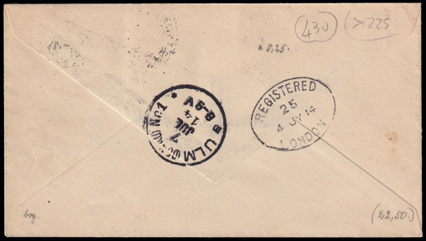 430 L image1904/12 KING GEORGE V. Registered cover to Germany via London Ju 4 1914 with multiple franking including the 3 sh green (SG 43+55+56). Arrival datestamp on reverse. (Image) (ImageA)