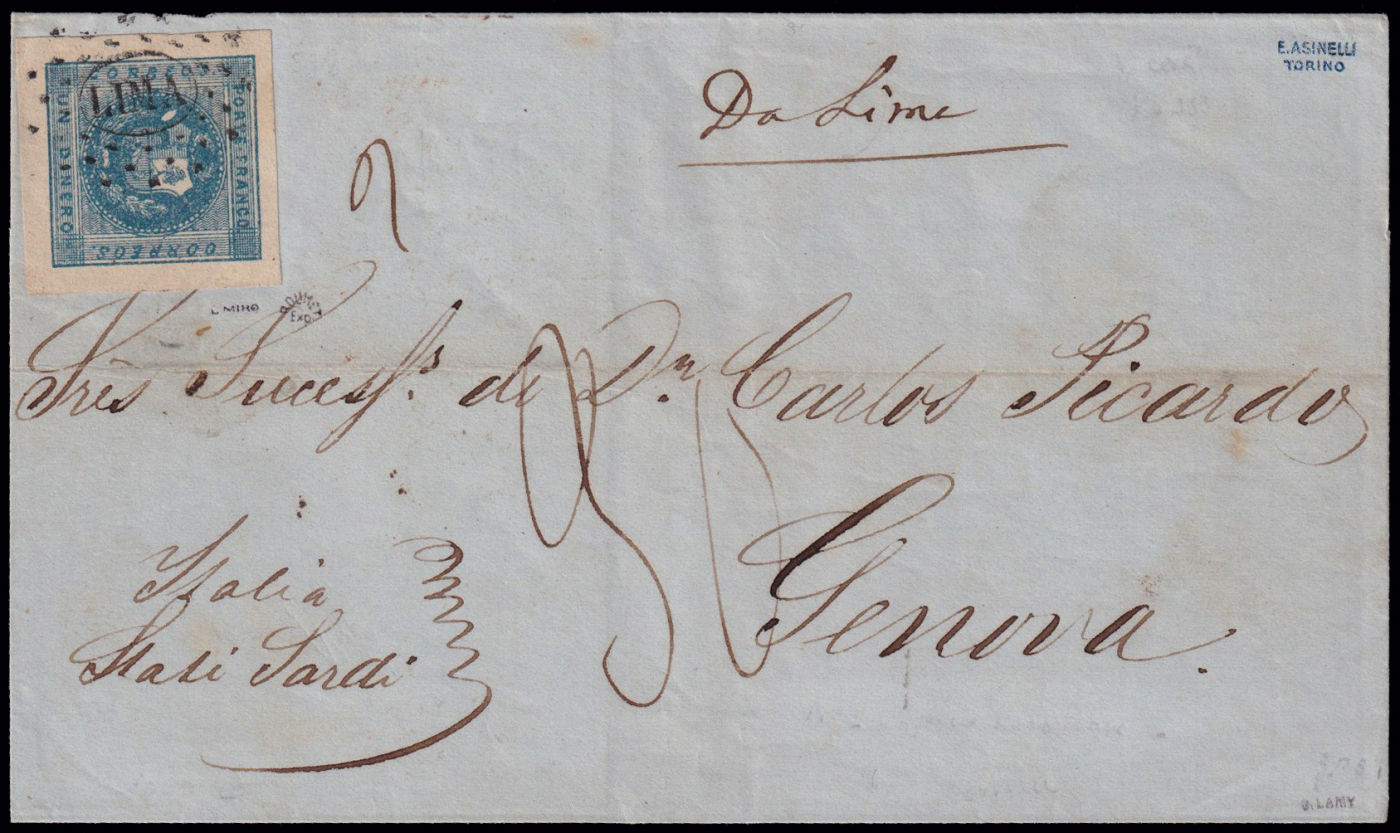 1858 COAT OF ARMS - SMALL LETTERS. Letter from Lima to Genova dated 27 FEB. 1859 franked with large margined 1 dinero blue (S.G. 3) and shipped via London - Paris- Genova. Transit postmarks and on the front charged