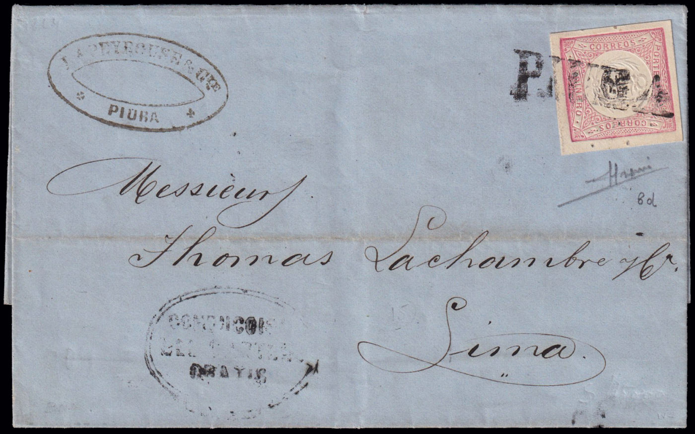 1862/63 LECOQ FIRST ISSUE. 1 d. vermilion (S.G. 12) a fine example used on 1864 (April 17) cover from Piura to Lima tied by linear handstamp PIURA. Arrival datestamp on reverse. Signed Sorani. (Image) (ImageA)