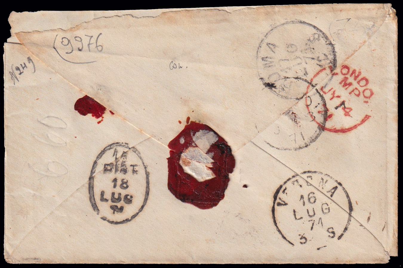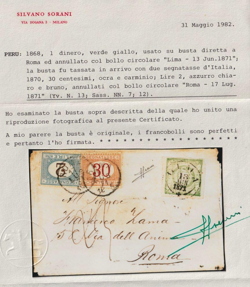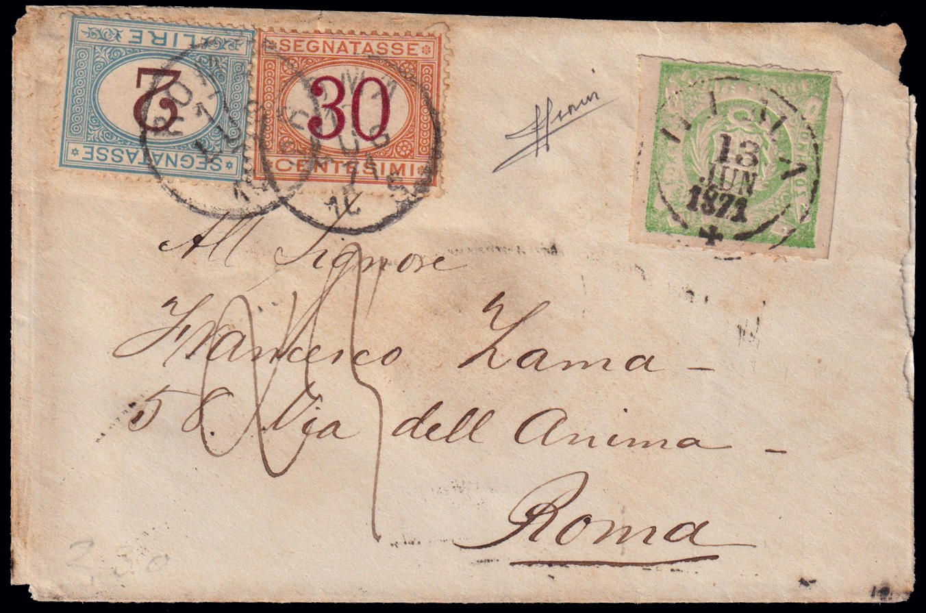 1868/72 LECOQ SECOND ISSUE. 1 d. yellow green used on cover to Roma tied by cds "Lima 13 JUN 1871". London - Verona transit datestamp on reverse and 2 lire and 30 cent. Postage Due on the front tied by Roma datestamp.