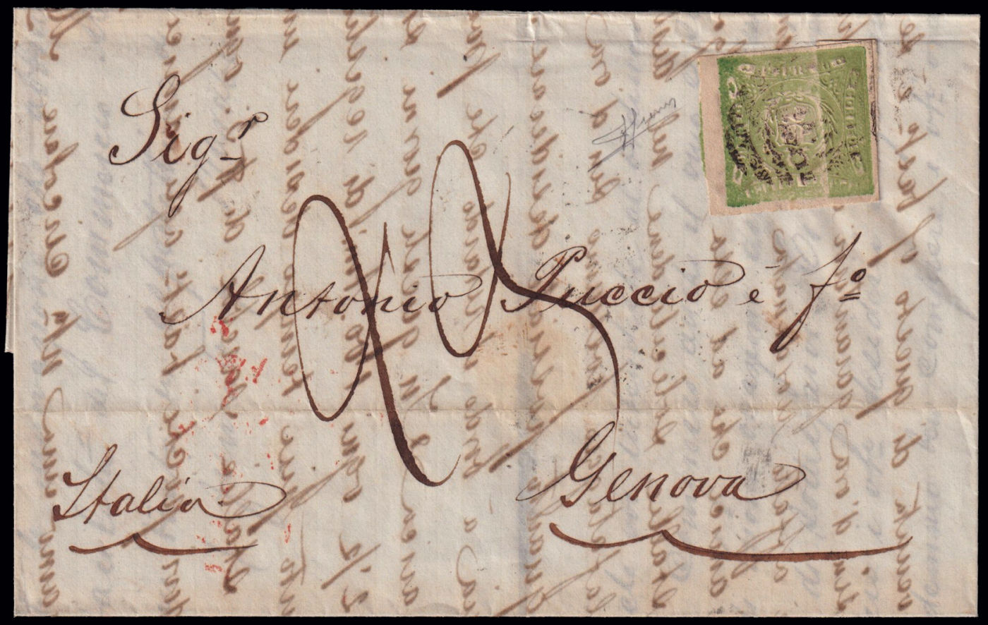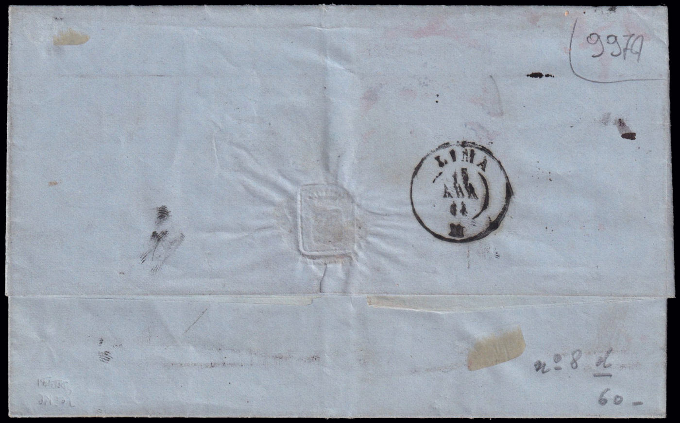 1858 COAT OF ARMS - SMALL LETTERS. Double rate letter from Lima to Genova dated 27 april 1858 prepaid with the 1 dinero light blu (S.G. 3). Cover shipped with the Pacific Steam Navigation and after crossing the Panama's