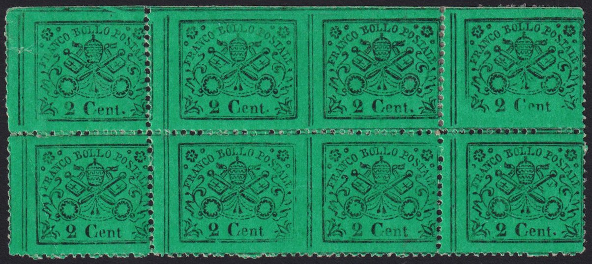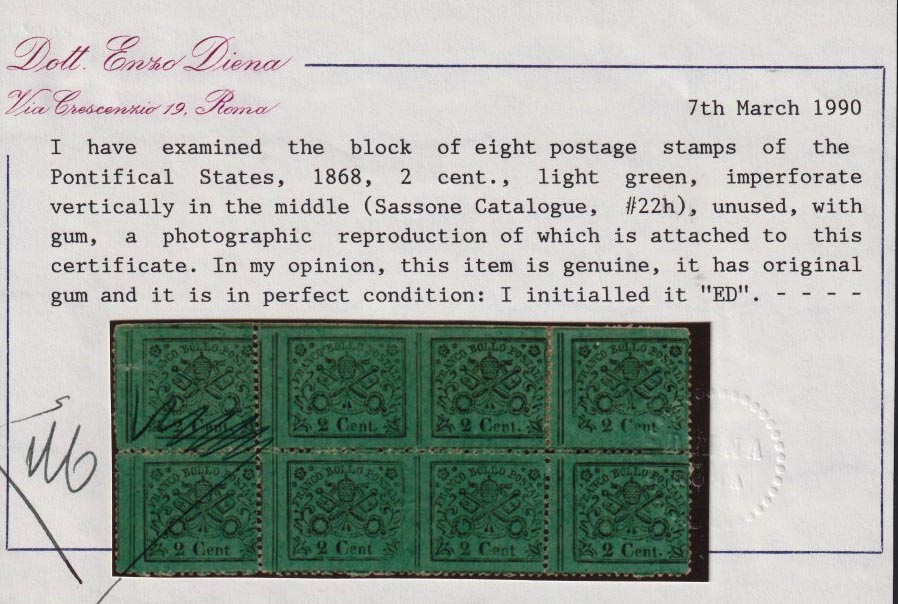 61 Z imageIII EMISSIONE DENTELLATA. Blocco di 8 francobolli da 2 centesimi con le due coppie centrali NON DENTELLATE IN MEZZO (Sassone 22h). Certificato E. Diena (1990). (Image) (ImageA) (ImageB)